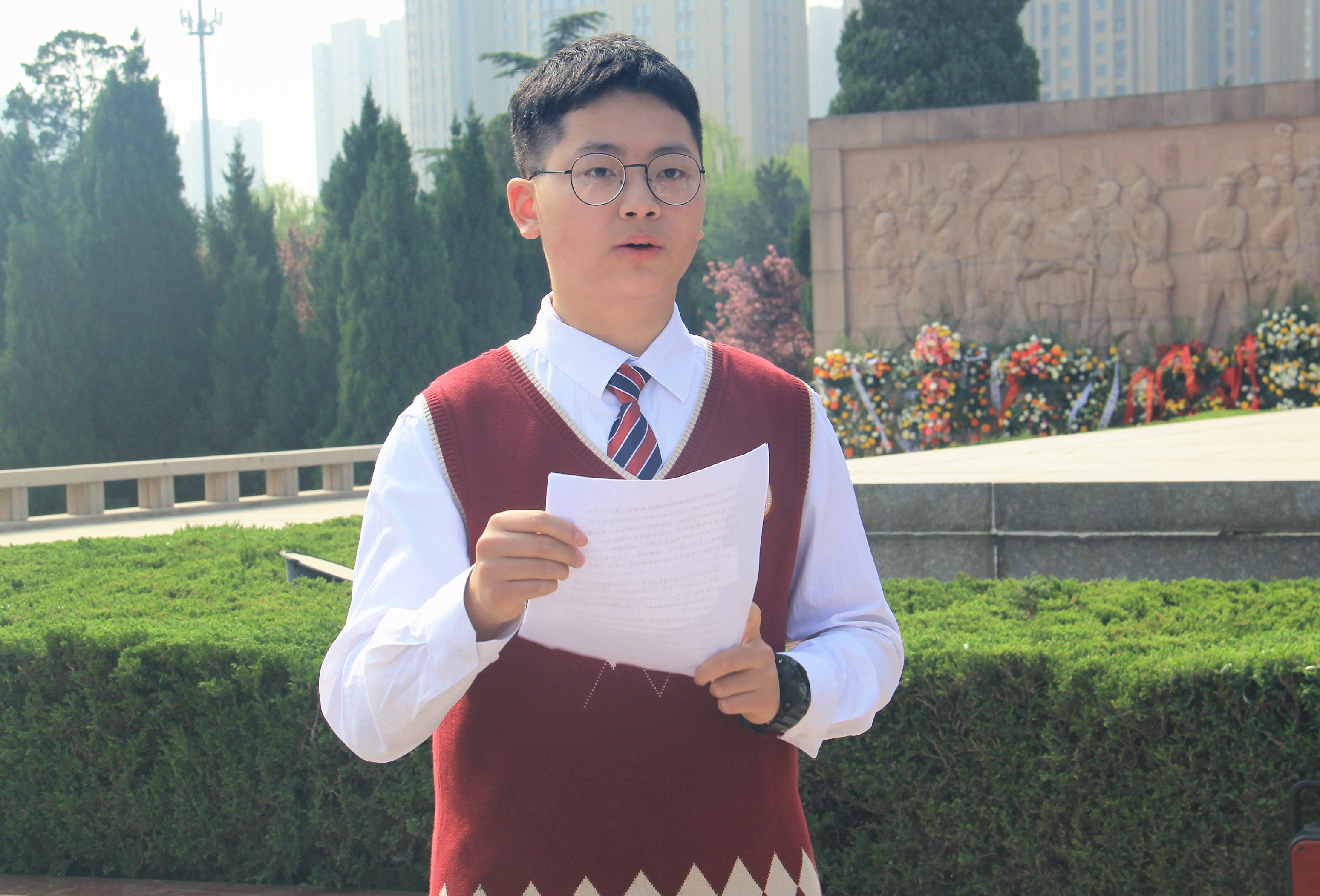 郑州49中师生代表整齐列队,缓步走向烈士纪念碑。