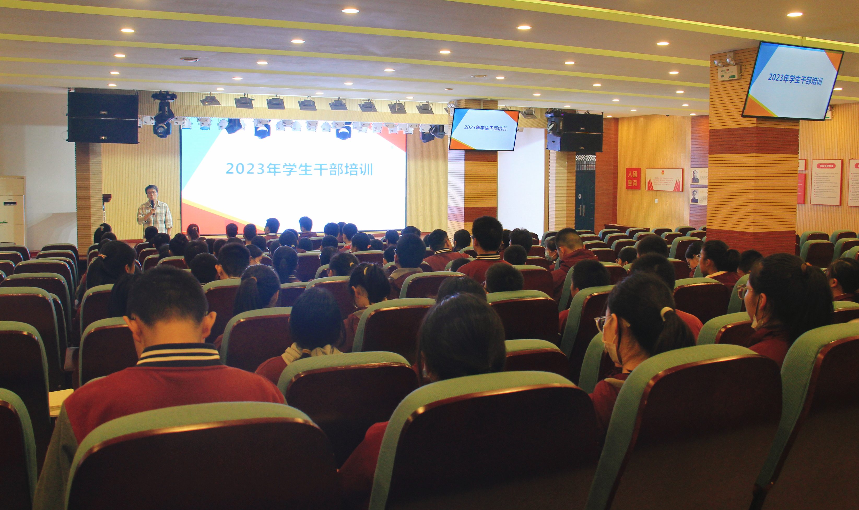 培训会在庄严的国歌声中开幕。首先,校团委书记刘冰从班干部职责、思想觉悟、行为表现、管理技巧、团队意识等内容进行分享。刘书记强调,学生干部是学校的先进分子,是自愿为同学服务的积极分子,所有学生干部在提供服务的同时,也在不断提高自己的工作能力和管理水平,一个合格的学生干部应具备良好的个人品德、较好的领导能力和责任心。他希望每一位学生干部积极上进,以身作则、当好标兵、做好先锋、突出表率作用,努力提高自己的工作能力,做到工作、学习两不误。