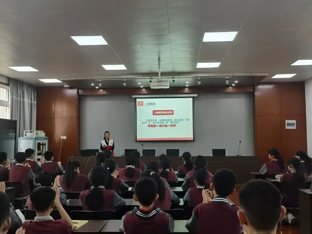 讲座中,中国红十字会总会李博雅老师为同学们详细解读了心肺复苏的重要性,特别针对心脏骤停等紧急情况下的应对策略进行了深入剖析。同时以通俗易懂的语言,清晰明了地讲解了心肺复苏(CPR)的标准操作流程,包括初步判断、紧急呼救、胸外按压、开放气道、人工呼吸等关键步骤,并强调了按压速率(每分钟100-120次)、按压深度(至少5-6厘米)以及30:2的按压与人工呼吸比例等要点。
