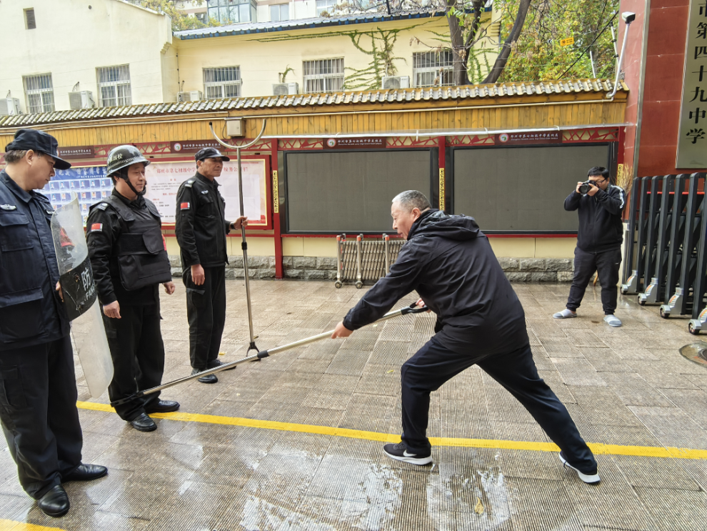 据悉,七初东校区高度重视,精心组织,成立了由分管安全副校长为组长的演练领导小组,全面统筹并细致规划活动的每一个环节。接着,保安公司队长首先详细讲解了警棍盾牌、钢叉等防暴器材的正确使用方法,并深入传授了反冲撞、防砍杀及对抗演练等反恐实战技能,还现场示范了在突发情况下的应急处置流程,包括如何迅速制服“歹徒”、如何有效防止“歹徒”进入人口密集区域等战术技巧,有利于提升校园安保人员的应急响应与处置能力。