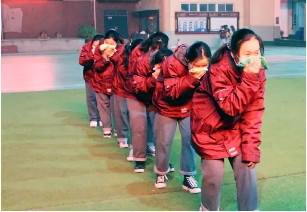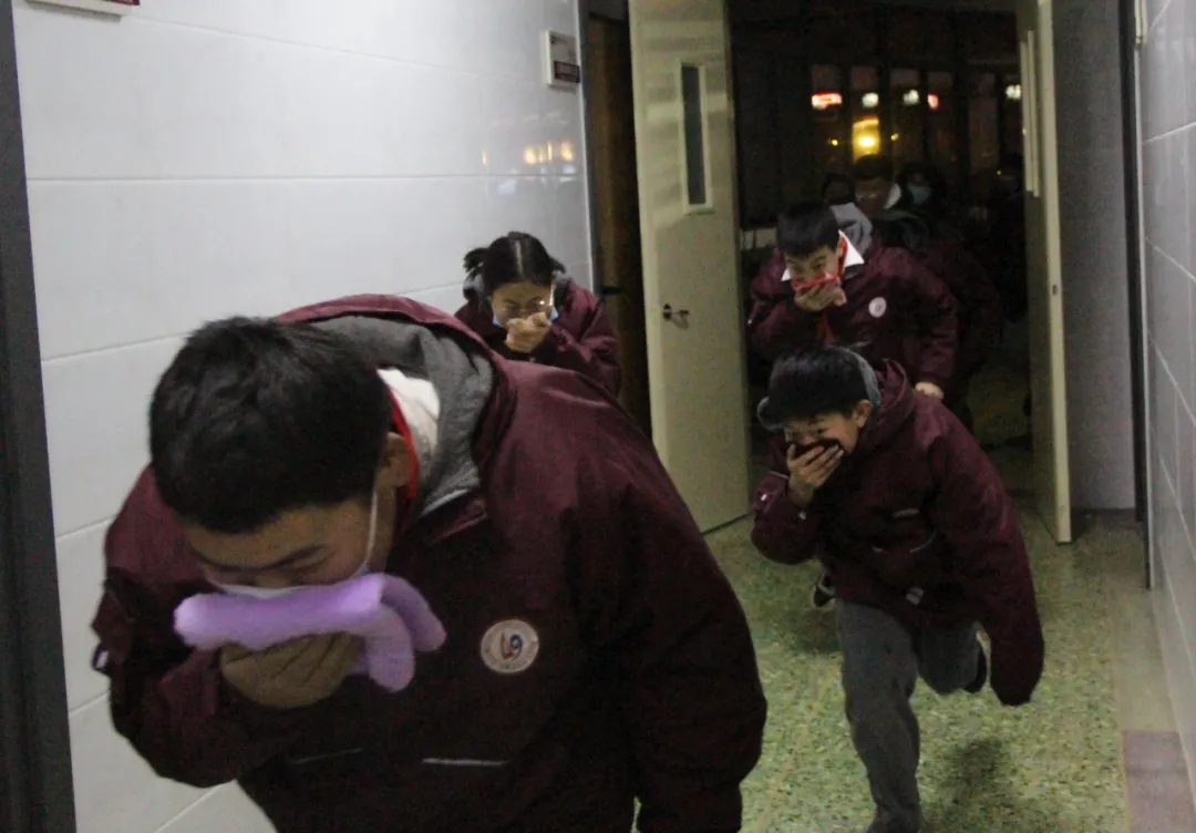 18点10,随着消防报警声的响起,全校近600名学生在老师的指引下,用湿毛巾捂住口鼻,弯腰捂鼻快速有序地按照规定的逃生路线撤离到学校操场。学生安全撤离到操场后,各班老师迅速清点本班学生人数,并立即报告校领导,整个演习用时1分56秒。