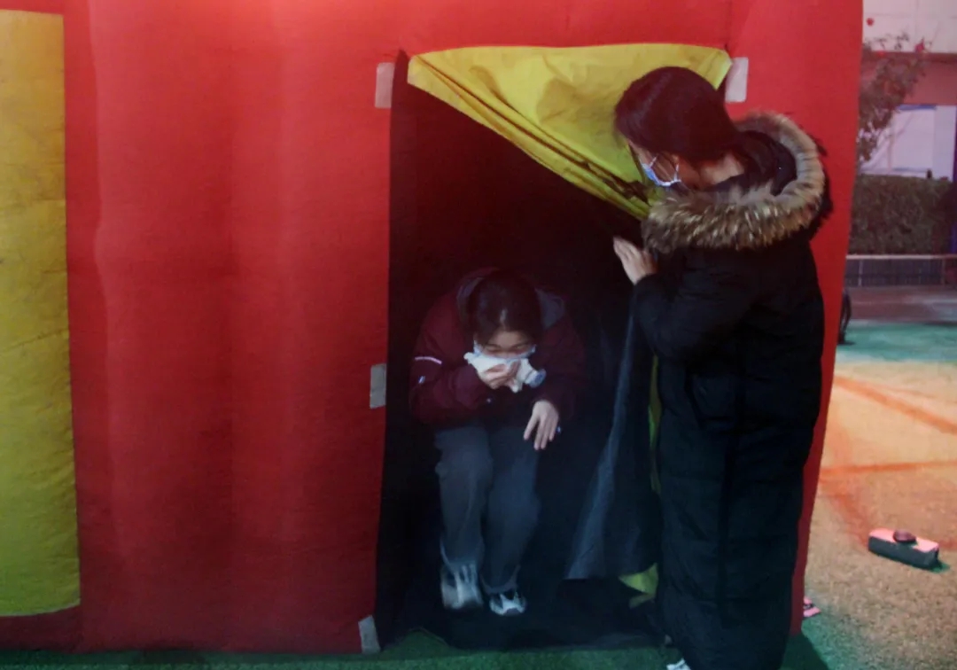 接着进行了消防帐篷的逃生体验,在消防教官的指导下,师生分批次进入,感受发生火灾时的真实情景。“逃生帐篷”的进口和出口分开设置,设有遮光用的门帘,帐篷内设有迂回曲折的隔断墙,学生在烟雾缭绕的帐篷内感受火灾发生时的模拟状态,按照帐篷内的标识找到正确的道路,最后顺利地从出口“逃生”。学生们纷纷表示:这次活动非常有意义,在帐篷里,我们知道不要慌张,同时弯腰,用湿毛巾捂住口鼻,学会看消防标识。