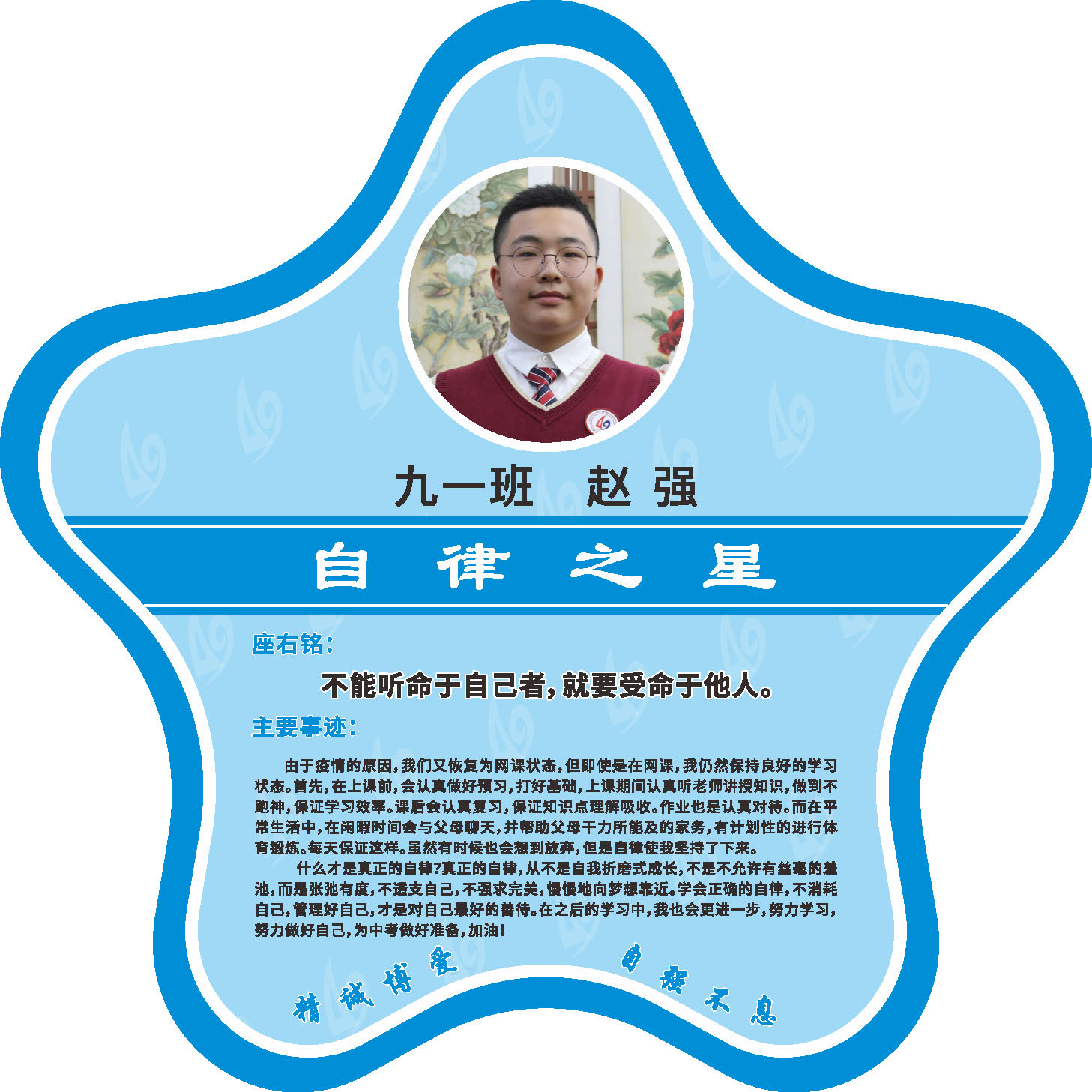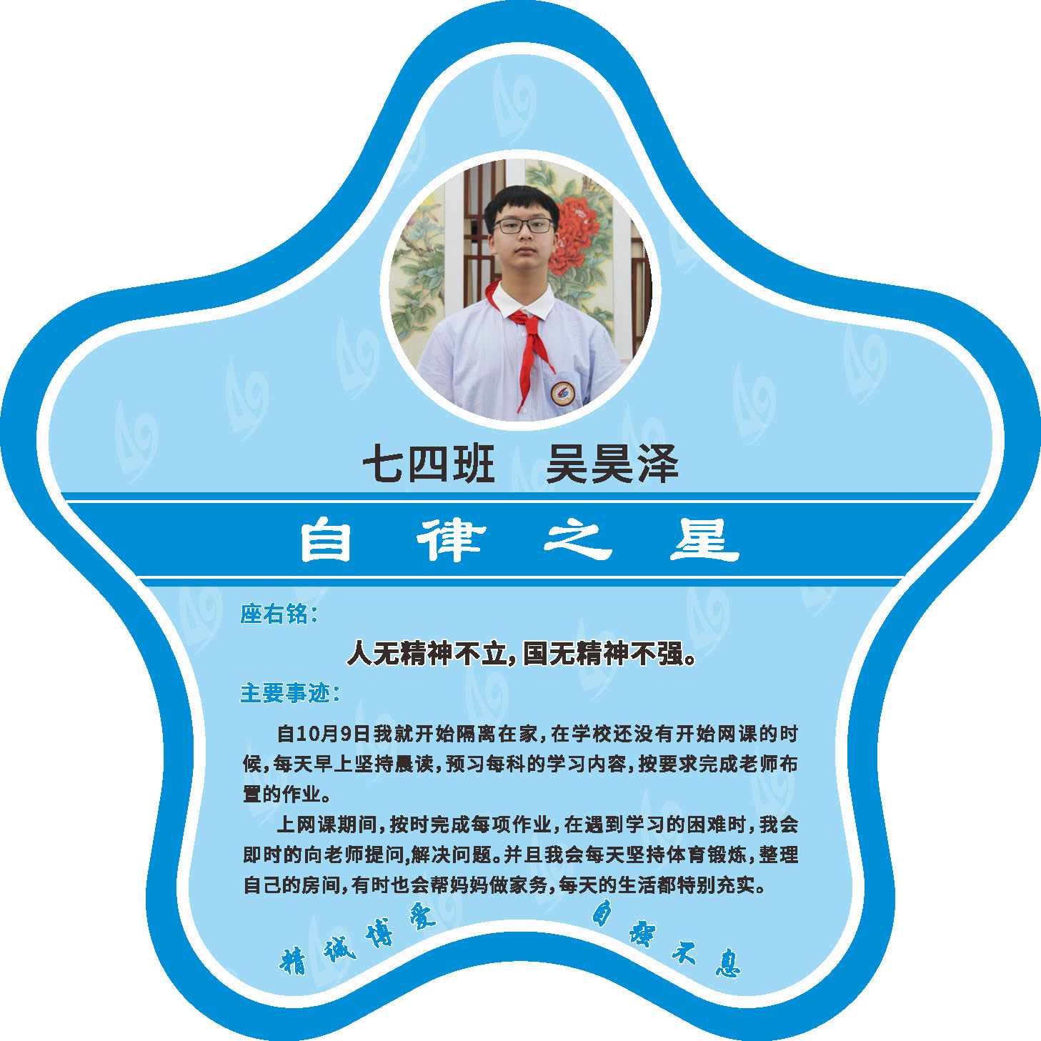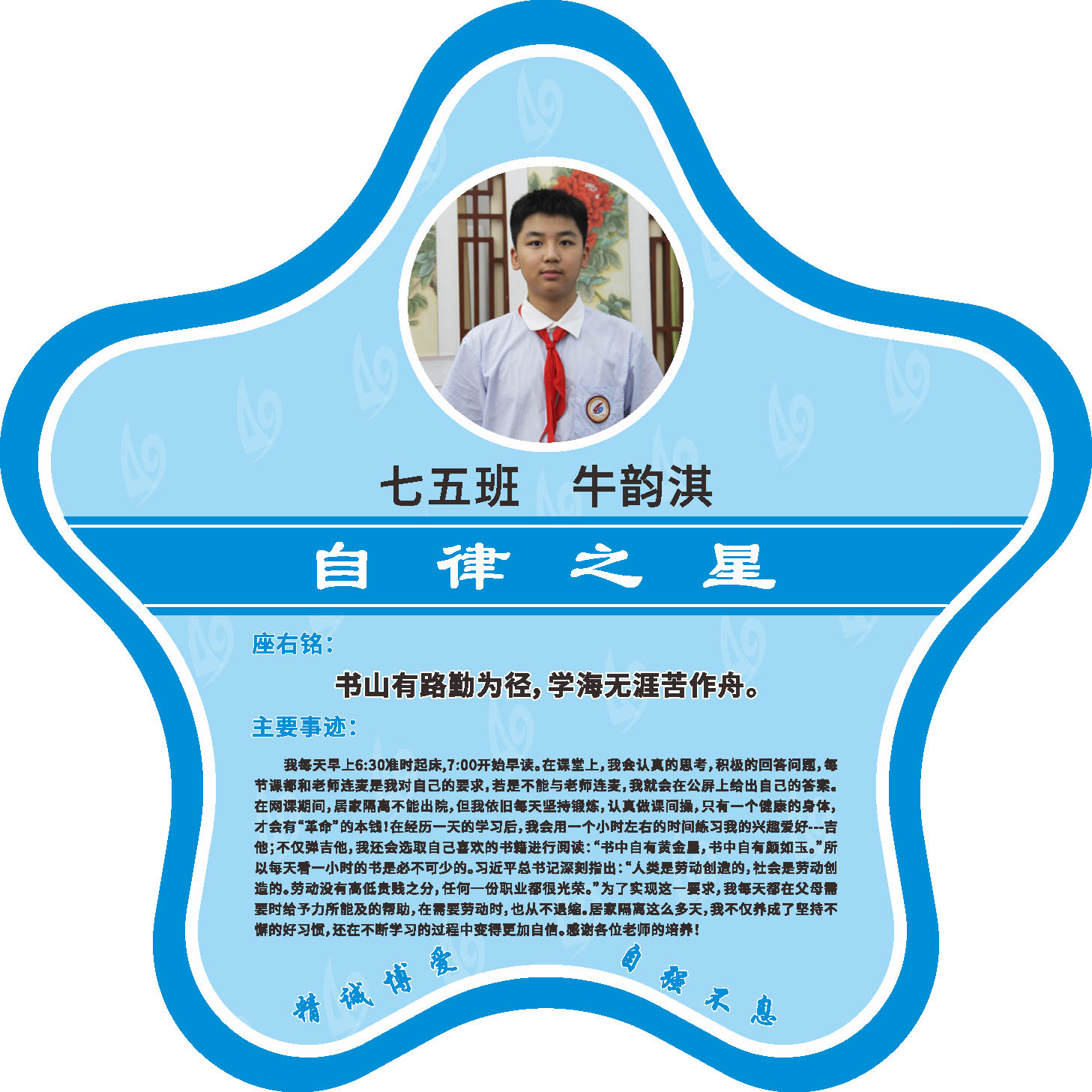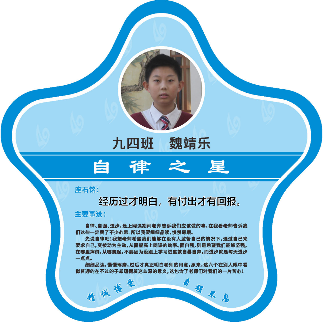 有明确的居家学习生活计划,并严格执行。认真有效的预习、 听课、复习,按时完成各项作业,合理使用电子设备,每天坚持阅读和体育锻炼。生活积极乐观,承担力所能及的家务,有自己的一项兴趣爱好,并为之付出努力。现经个人申报,班级推荐,学校审核,评选出2022年10月《自律之星》。