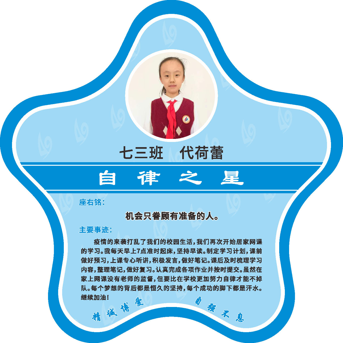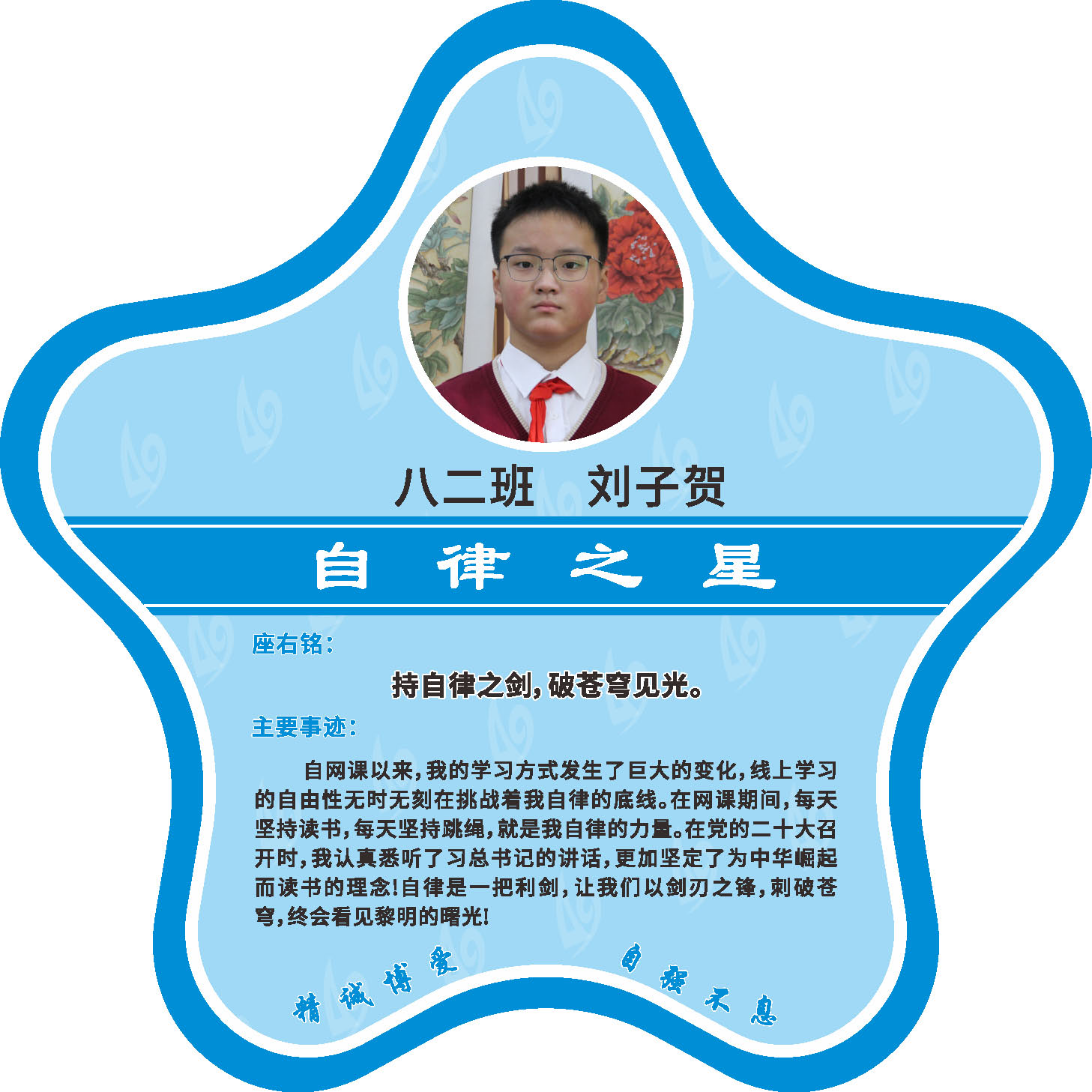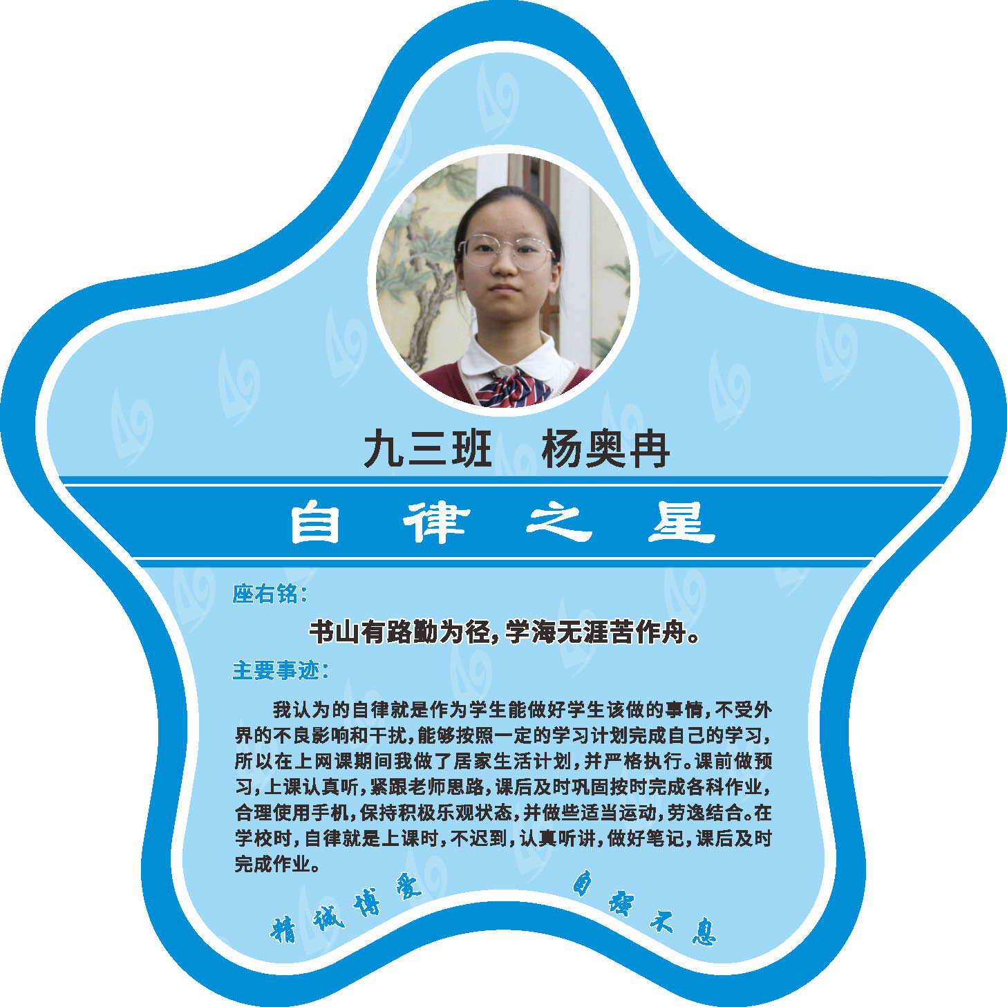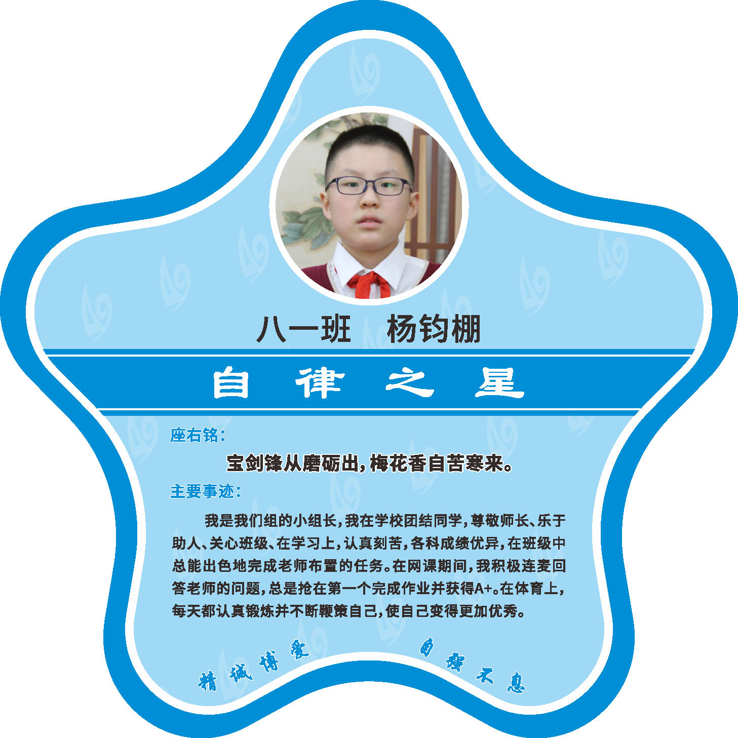 有明确的居家学习生活计划,并严格执行。认真有效的预习、 听课、复习,按时完成各项作业,合理使用电子设备,每天坚持阅读和体育锻炼。生活积极乐观,承担力所能及的家务,有自己的一项兴趣爱好,并为之付出努力。现经个人申报,班级推荐,学校审核,评选出2022年10月《自律之星》。