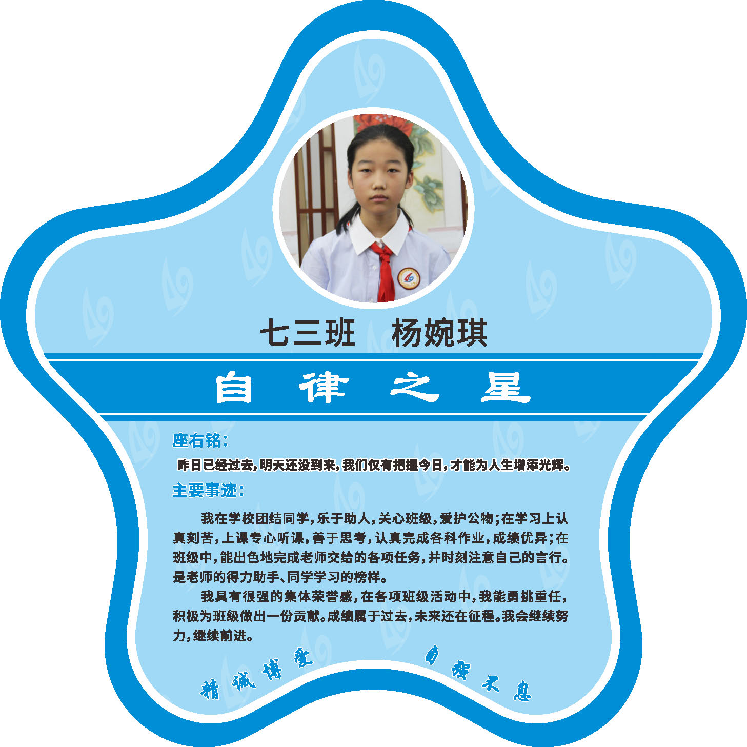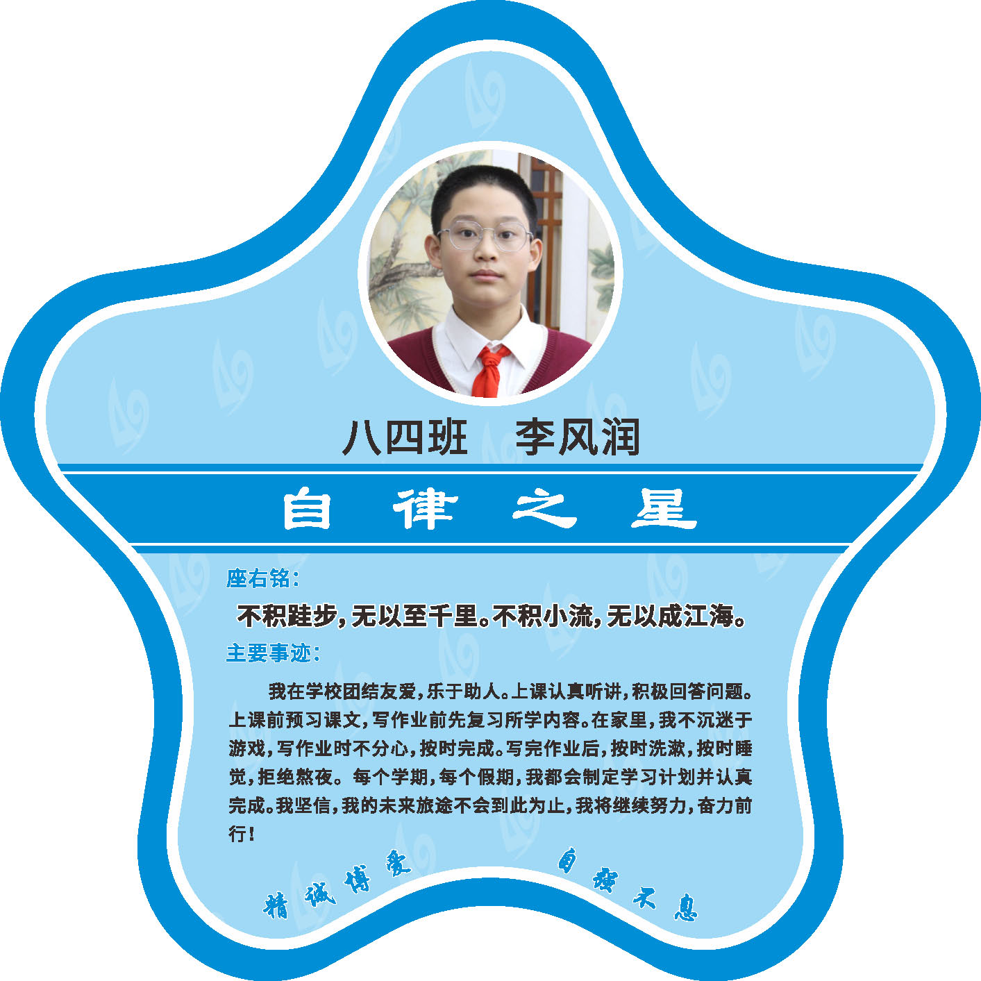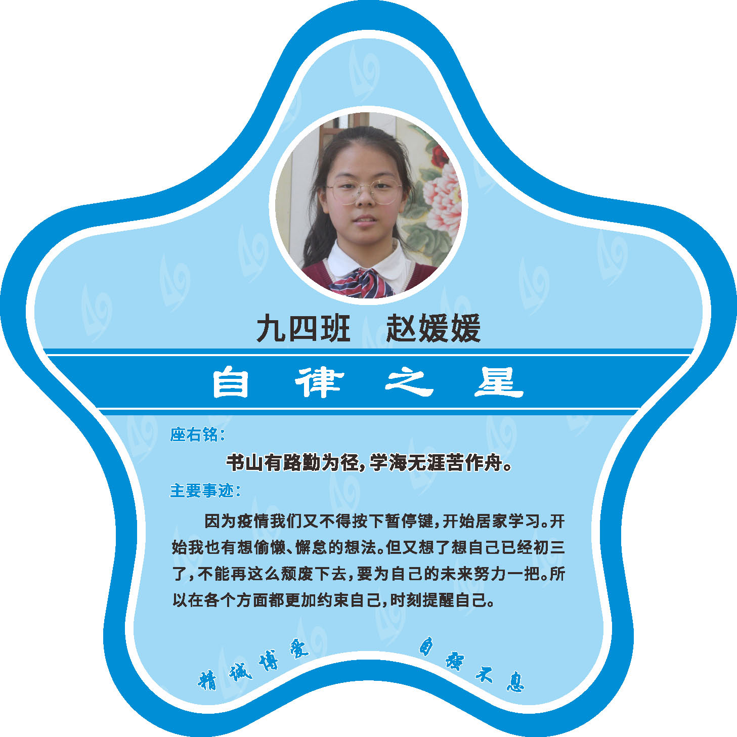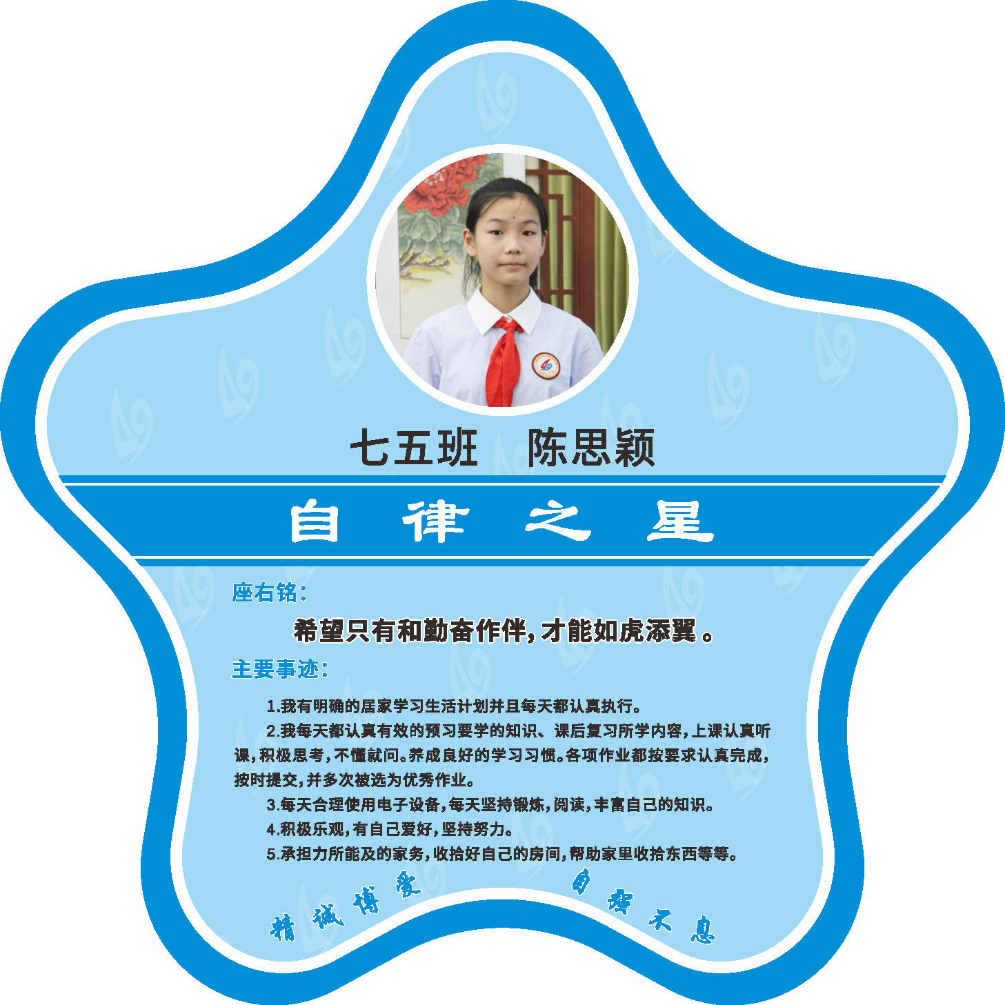 有明确的居家学习生活计划,并严格执行。认真有效的预习、 听课、复习,按时完成各项作业,合理使用电子设备,每天坚持阅读和体育锻炼。生活积极乐观,承担力所能及的家务,有自己的一项兴趣爱好,并为之付出努力。现经个人申报,班级推荐,学校审核,评选出2022年10月《自律之星》。