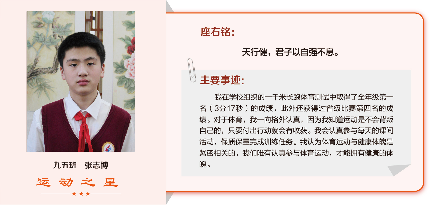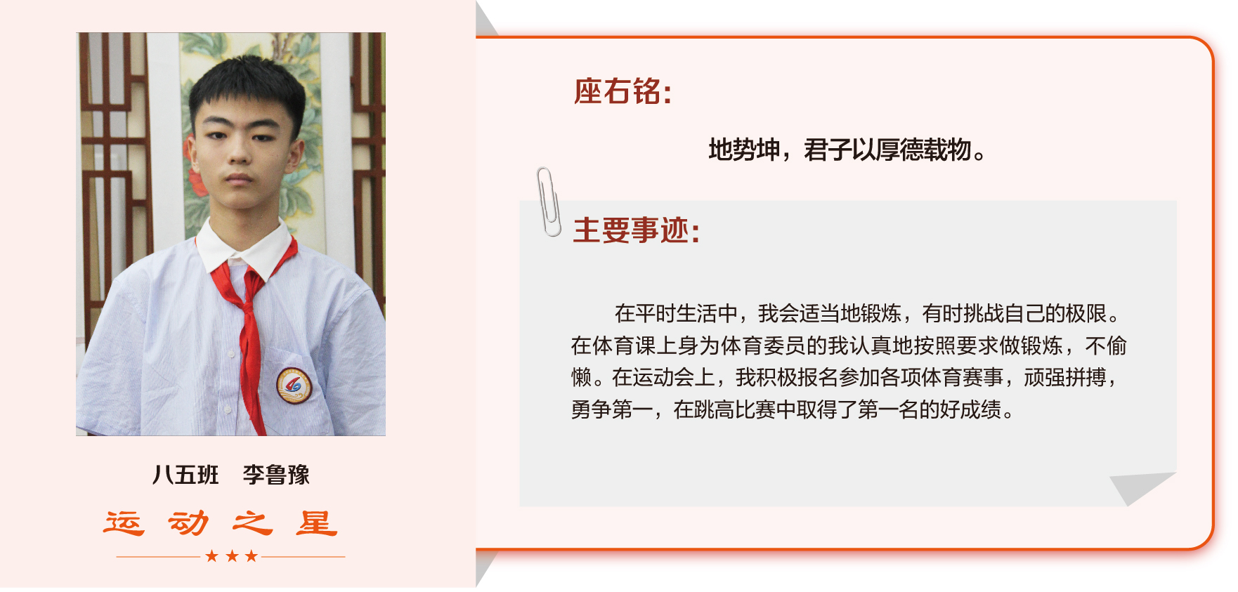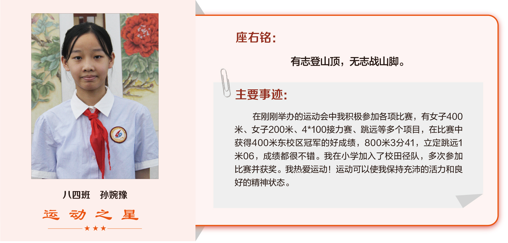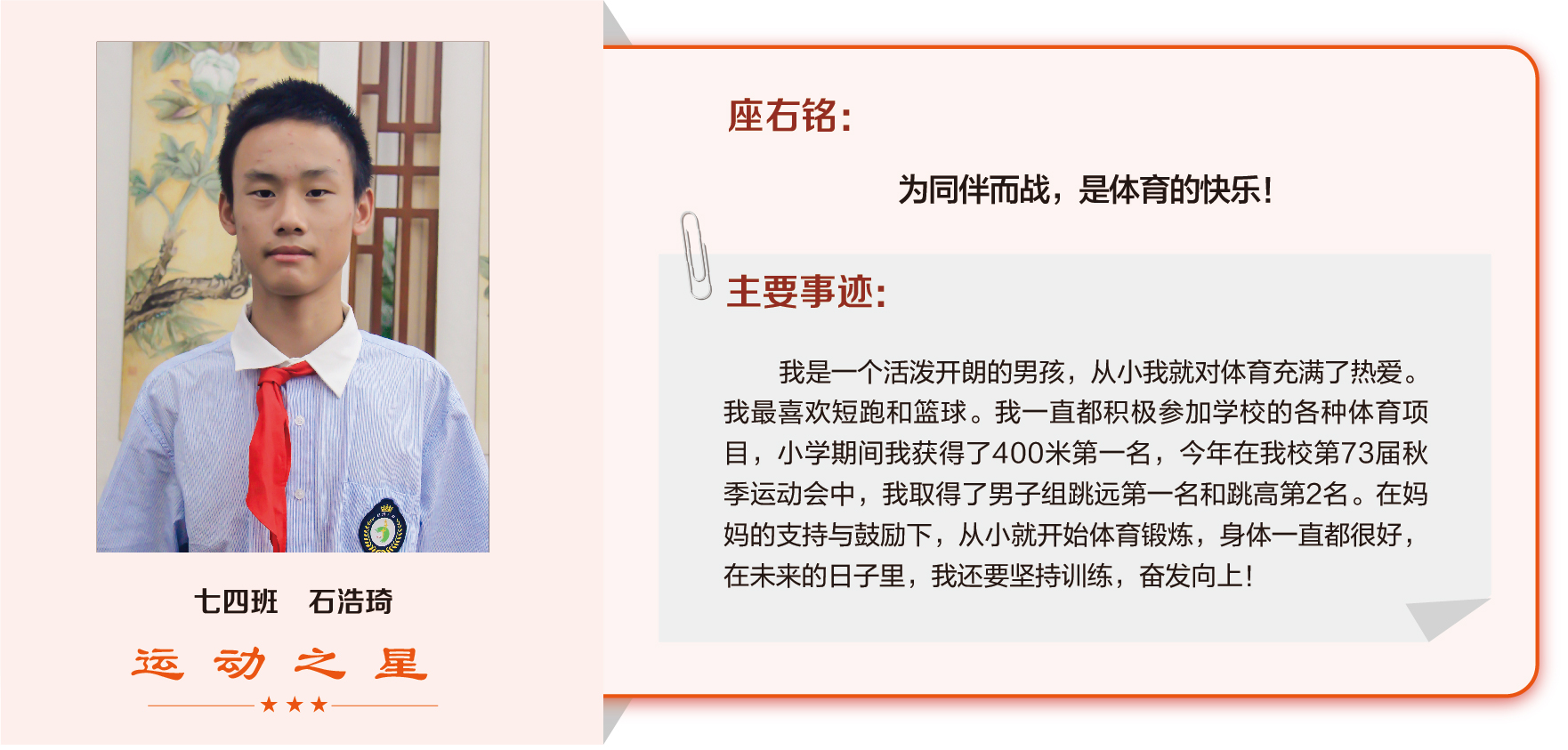 他们在运动会期间为班级争光,奔跑在运动场上,他们认真做眼保健操,大课间整齐跑步,口号响亮,经个人申报,班级推荐,学校审核评选出本期《运动之星》。