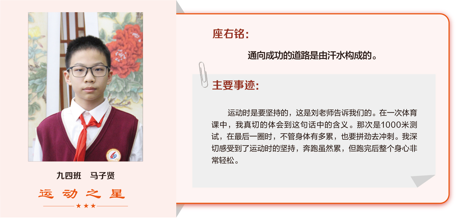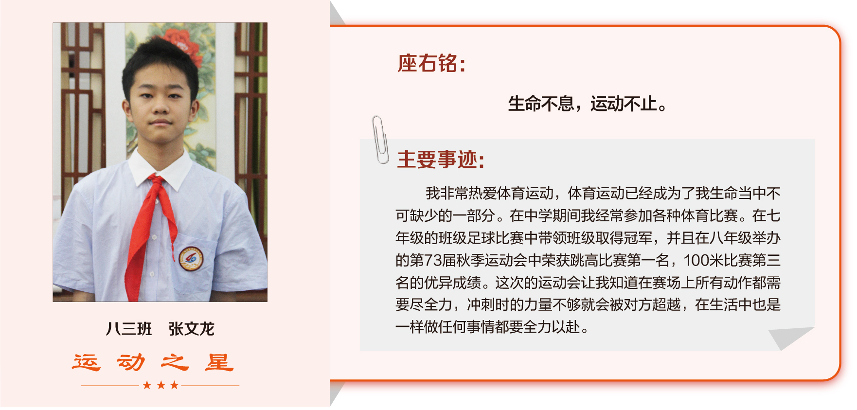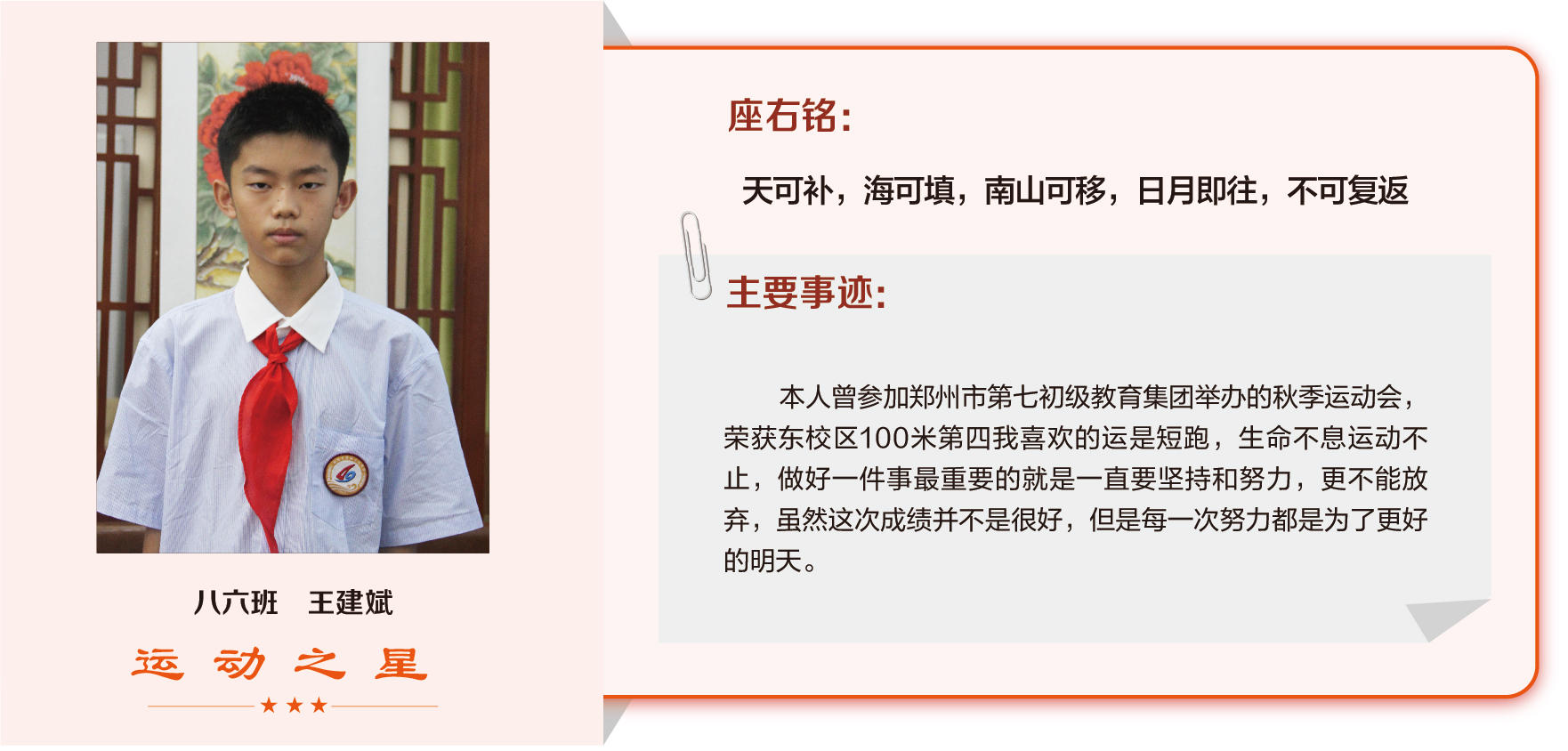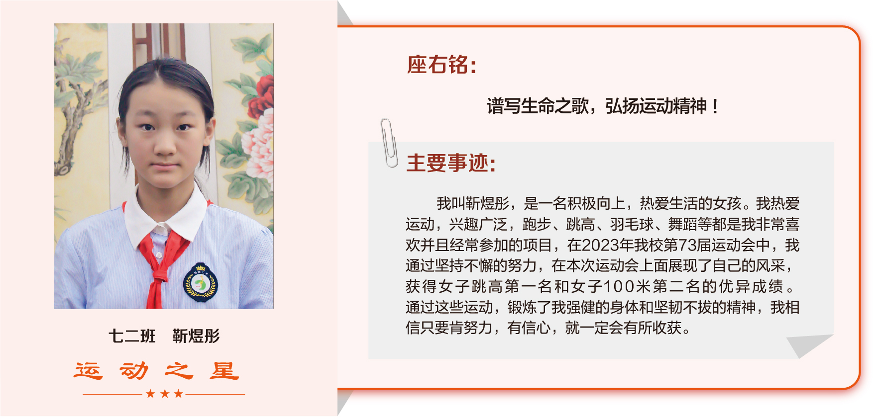 他们在运动会期间为班级争光,奔跑在运动场上,他们认真做眼保健操,大课间整齐跑步,口号响亮,经个人申报,班级推荐,学校审核评选出本期《运动之星》。