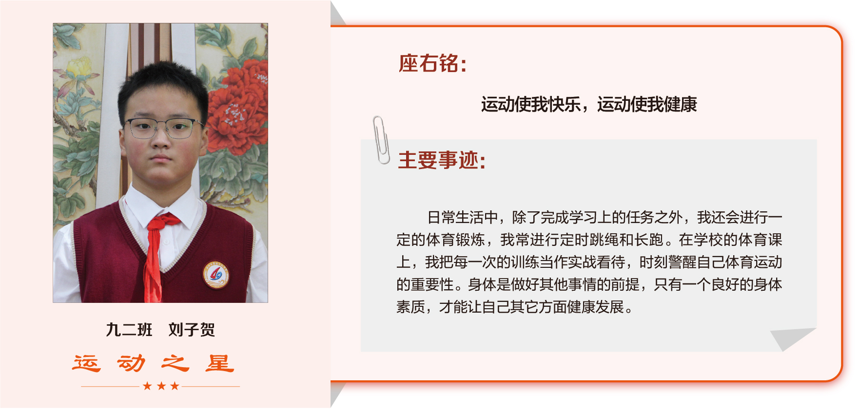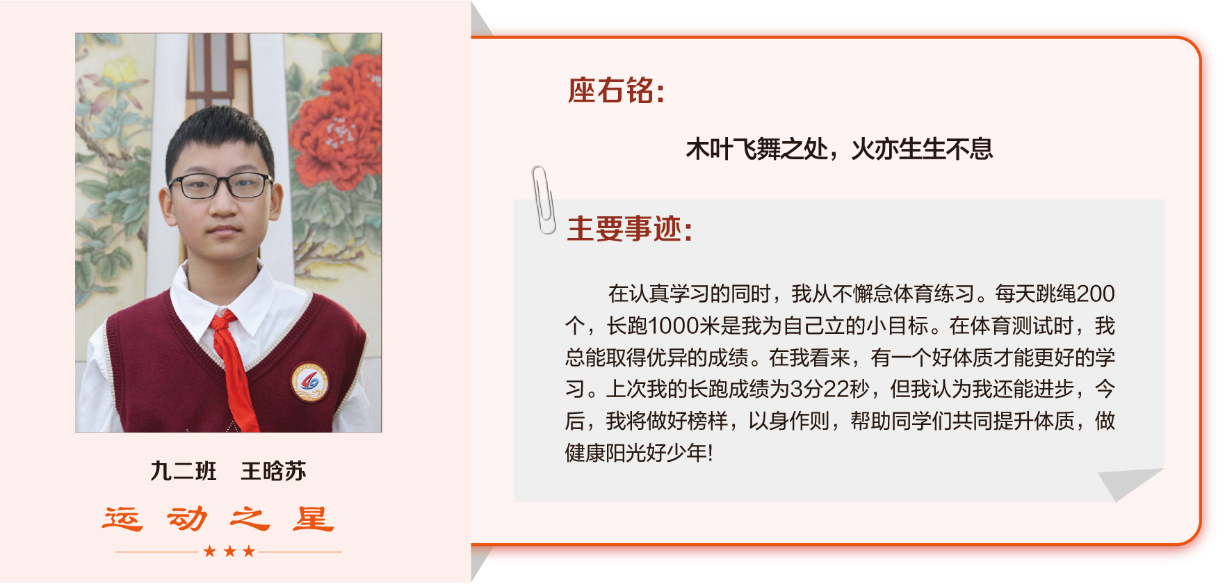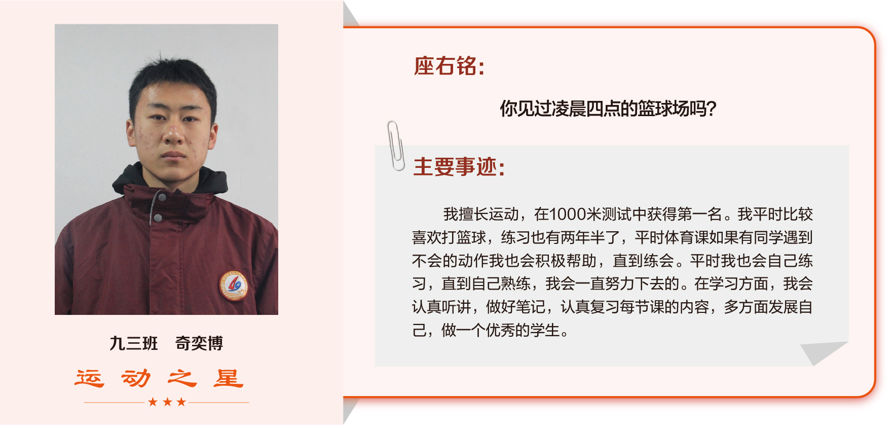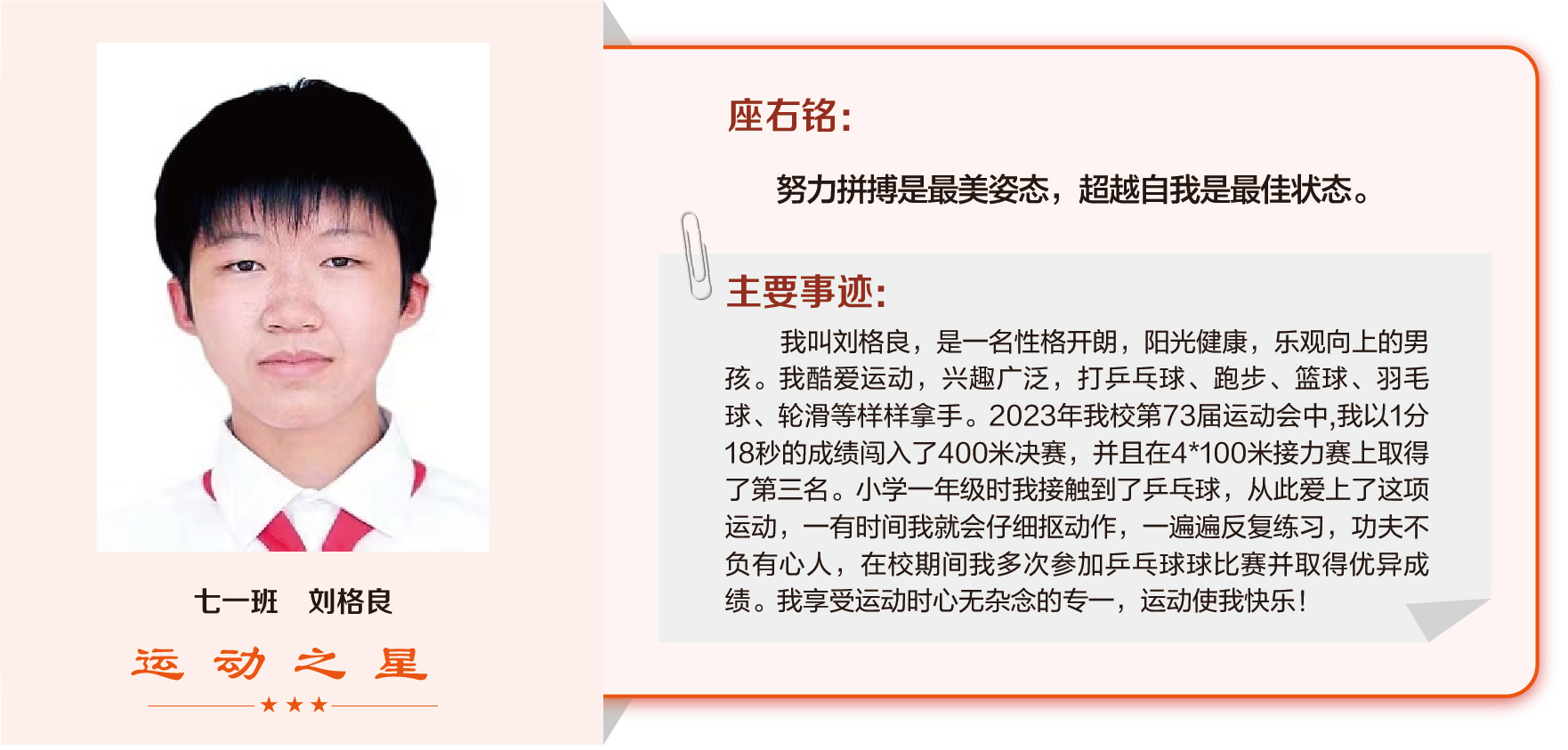 他们在运动会期间为班级争光,奔跑在运动场上,他们认真做眼保健操,大课间整齐跑步,口号响亮,经个人申报,班级推荐,学校审核评选出本期《运动之星》。