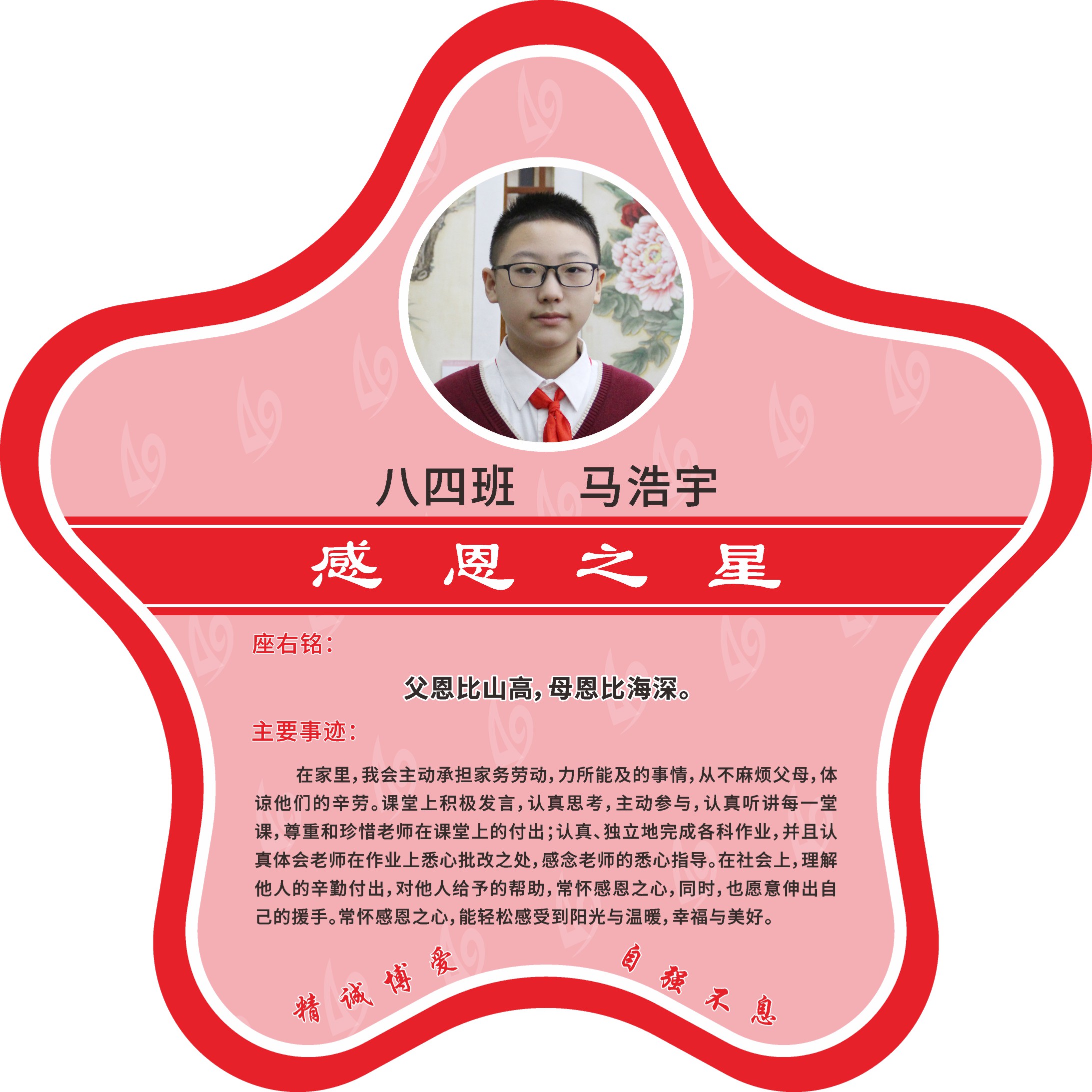 感知身边的幸福与美好,日常生活中理解父母,以实际行动感恩父母,尊重老师,努力学习,感念老师的悉心指导,饮水思源,承担责任,对同伴、对家庭、对社会传递阳光和温暖。现经个人申报,班级推荐,学校审核,评选出2022年11月《感恩之星》。