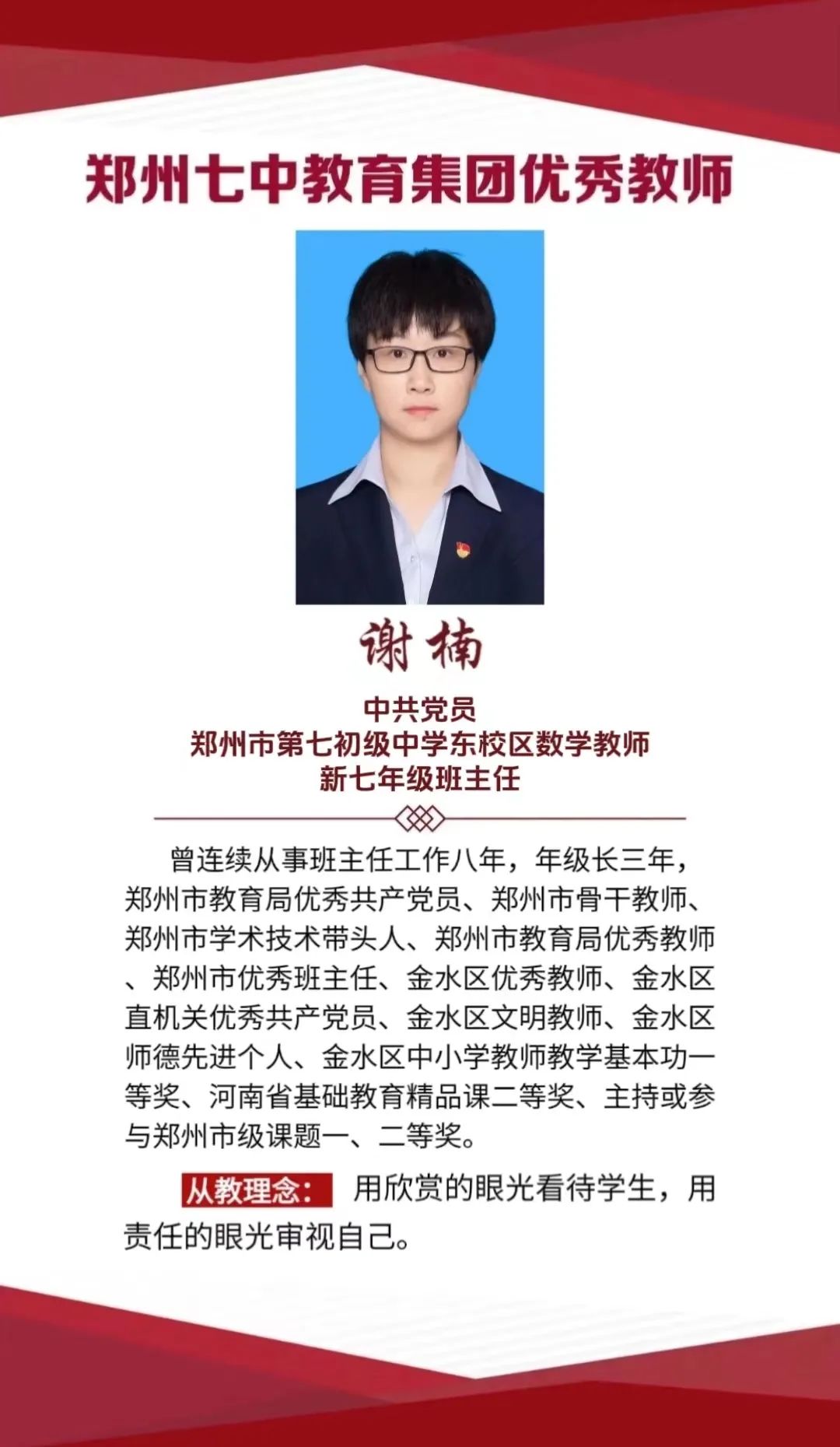据了解,七三班班主任谢楠老师连续多年从事班主任工作,曾担任年级长和教研组长,是郑州市学术技术带头人,郑州市骨干教师,郑州市优秀班主任,郑州市教育局优秀教师,郑州市教育局优秀共产党员。谢楠老师主讲的公开课曾多次荣获郑州市一等奖。