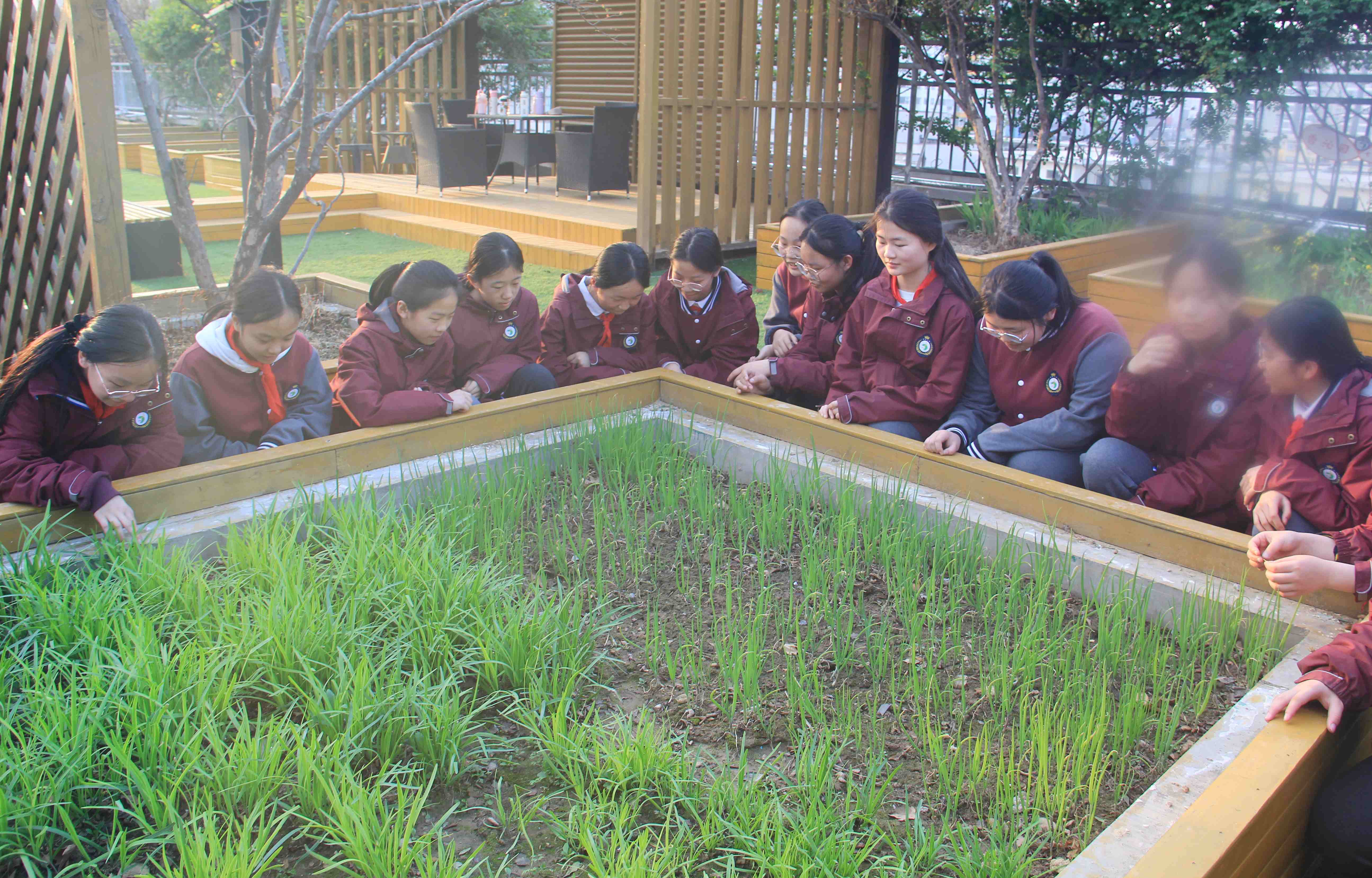 劳动教育实践课程包括教会学生清理杂草、平整土地、翻土、给树木施肥浇水、种菜等劳动技能,同学们认真学习,干劲十足。