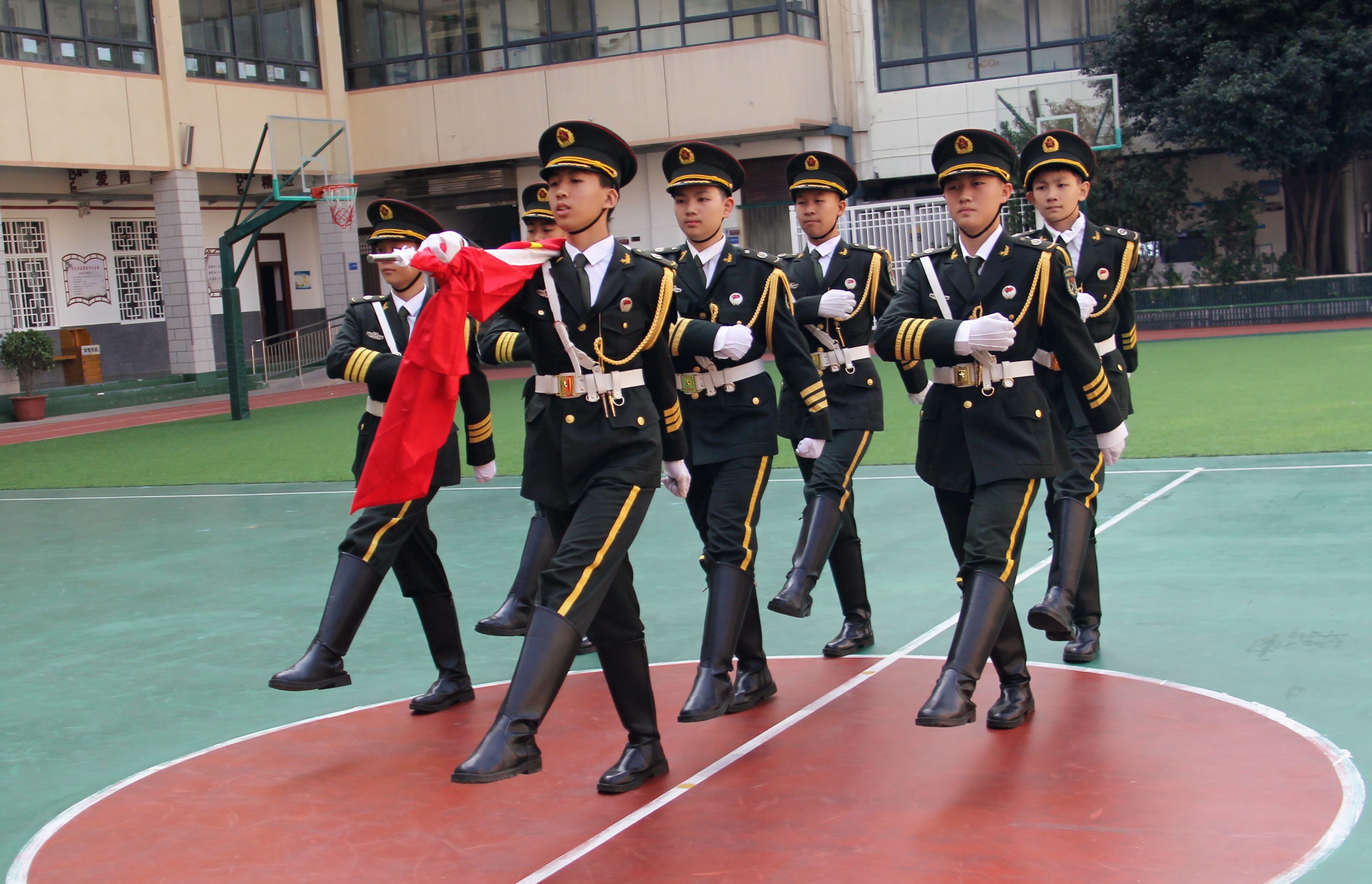 在体育组李敏宽老师的悉心指导下,同学们从站姿、转法、齐步、正步、跑步、敬礼、摆臂等动作练起,经过一个月的认真学习和刻苦训练,熟练掌握了升旗流程和动作要领,最终,他们在周一的升旗仪式中完美亮相,获得了全校师生的一致好评。