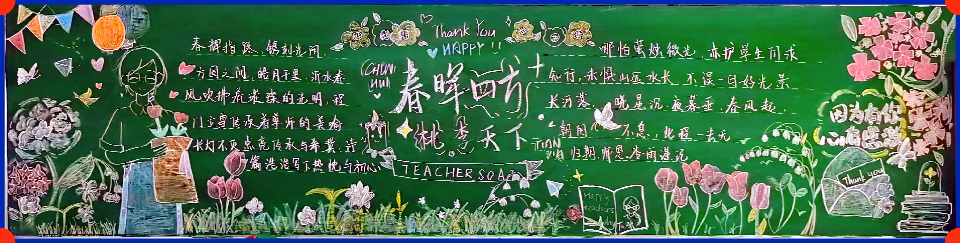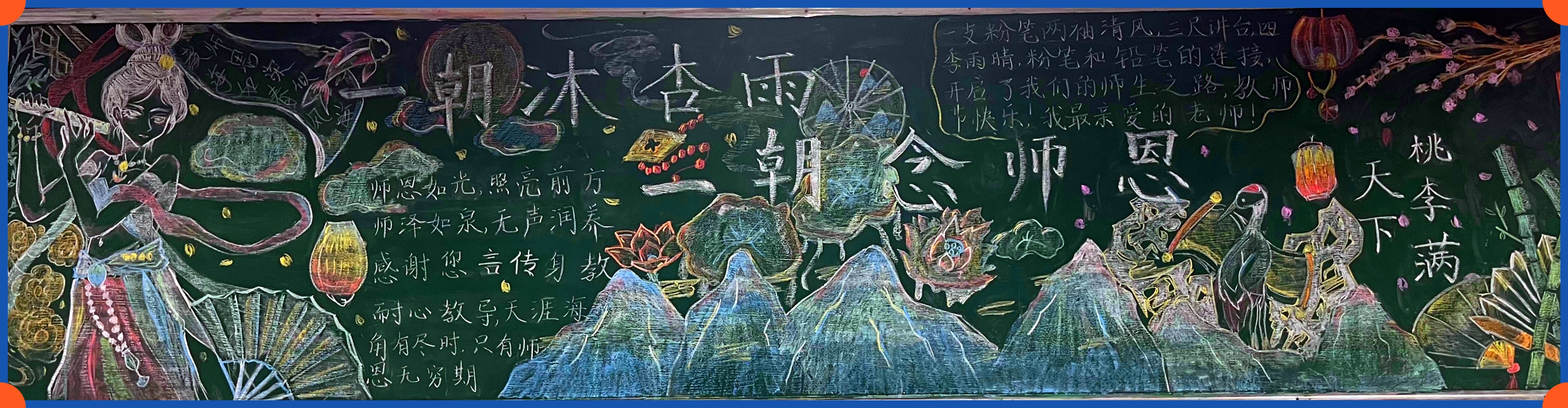 同学们怀着对老师崇高的敬意和满腔的热情,积极参与主题板报绘制。经过同学们精心策划,一幅幅构思新颖、主题鲜明、图文并茂的黑板报完美呈现在师生眼前,成为一道靓丽的班级风景线。在板报绘画过程中,同学们既展现了设计和绘画才能,也用笔墨丹青表达了对教师的感恩和祝福。