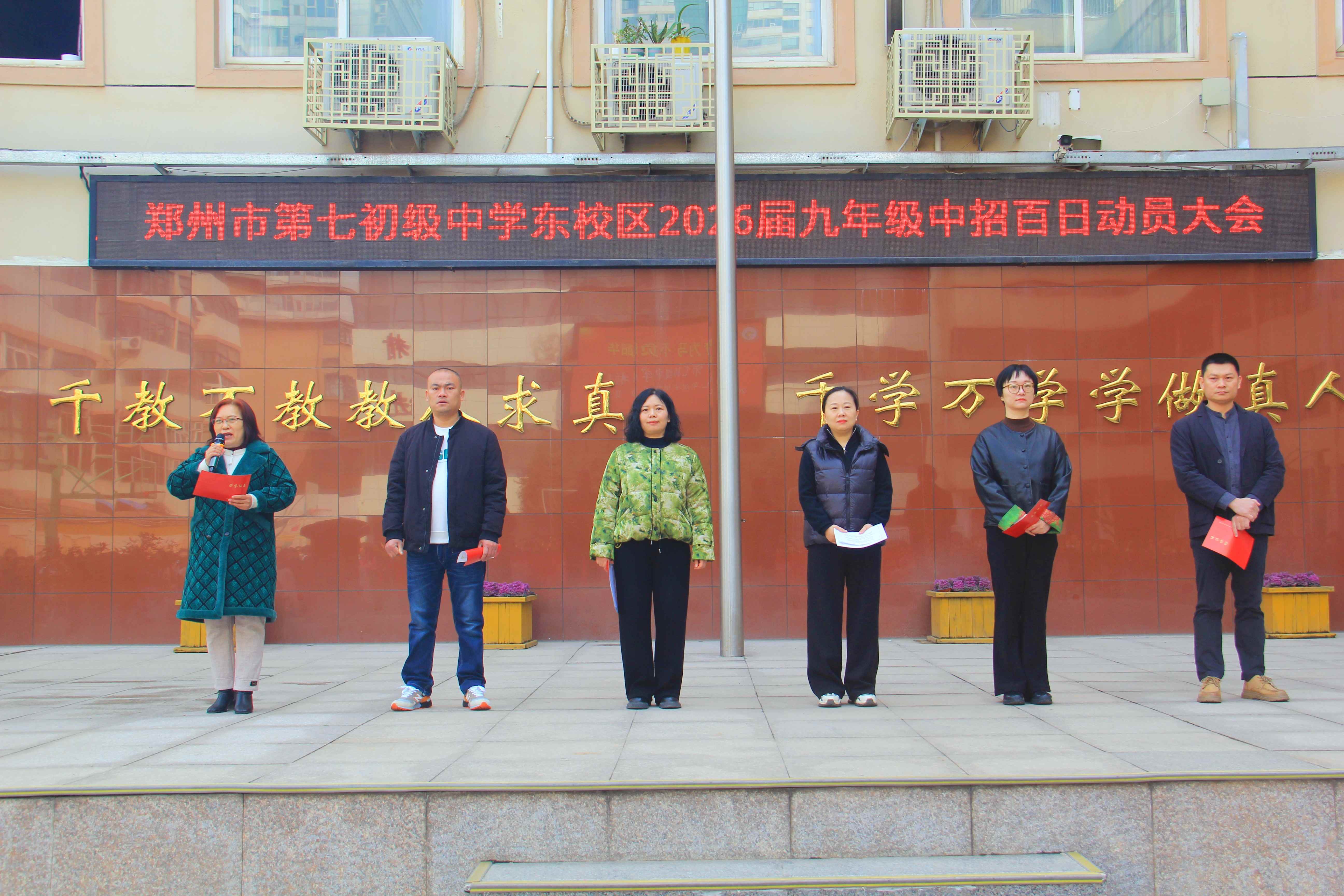 三尺讲台育桃李,百日相伴赴征程。七初东校区选派六位班主任作为教师代表登台发言,老师们细数与同学们相伴的点滴,道出了对学子们的深切期盼。他们郑重承诺,将始终与同学们并肩同行,全程陪伴、悉心指导,为大家答疑解惑、保驾护航,用专业与责任,助力每一位学子向着理想奋力前行。暖心的话语,让学子们感受到了老师的关怀与力量,也更加坚定了脚踏实地、奋力拼搏的信念。