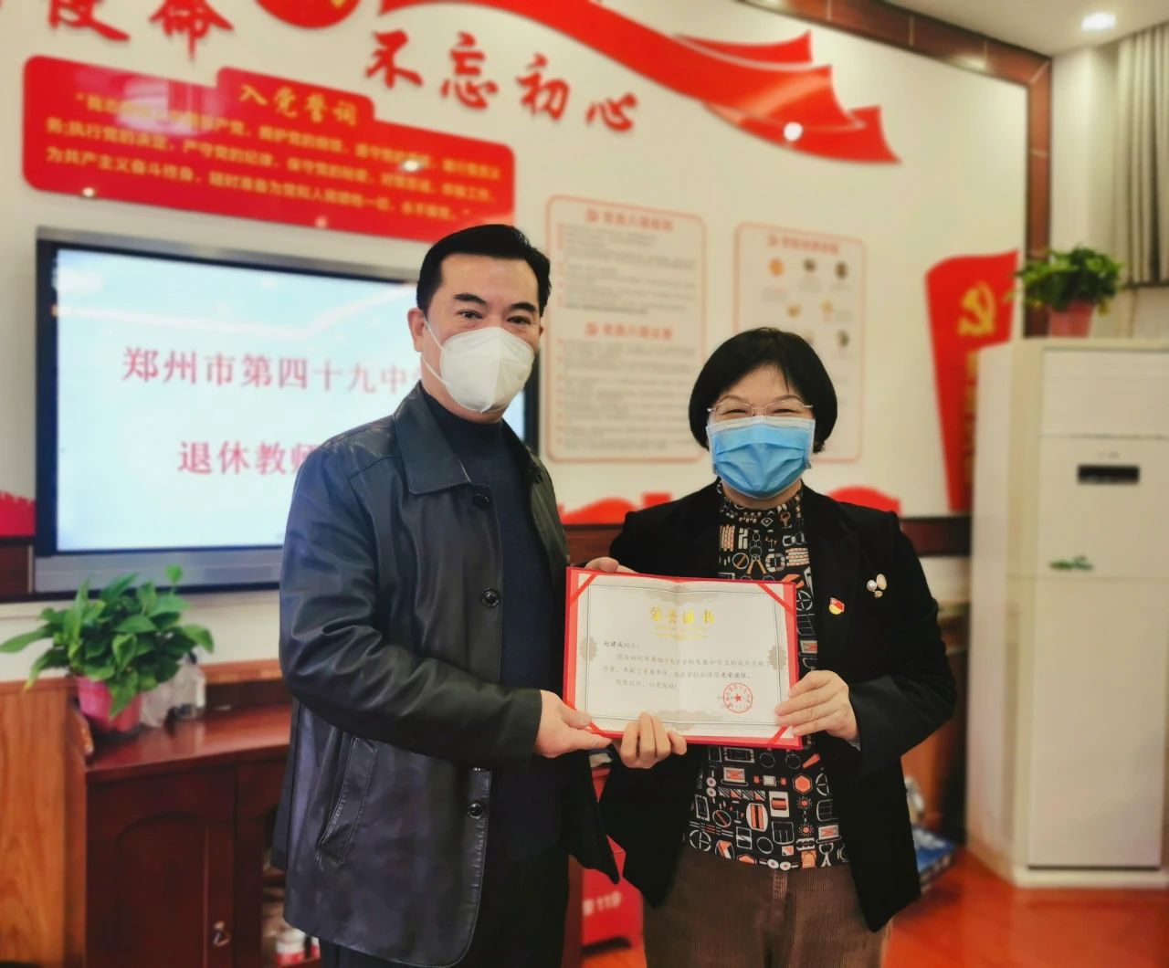 郑州49中校长张永红为赵建成颁发光荣退休荣誉证书