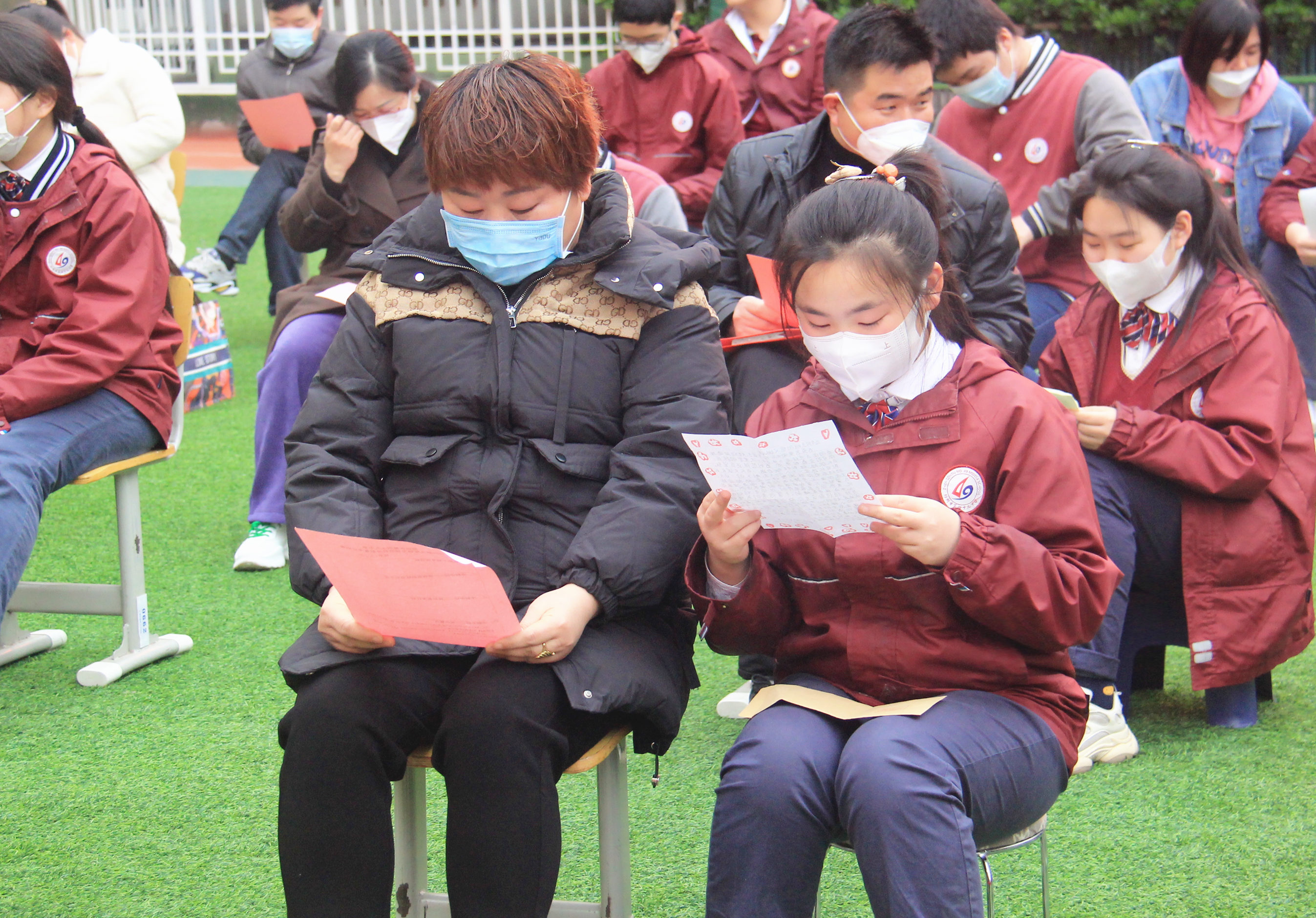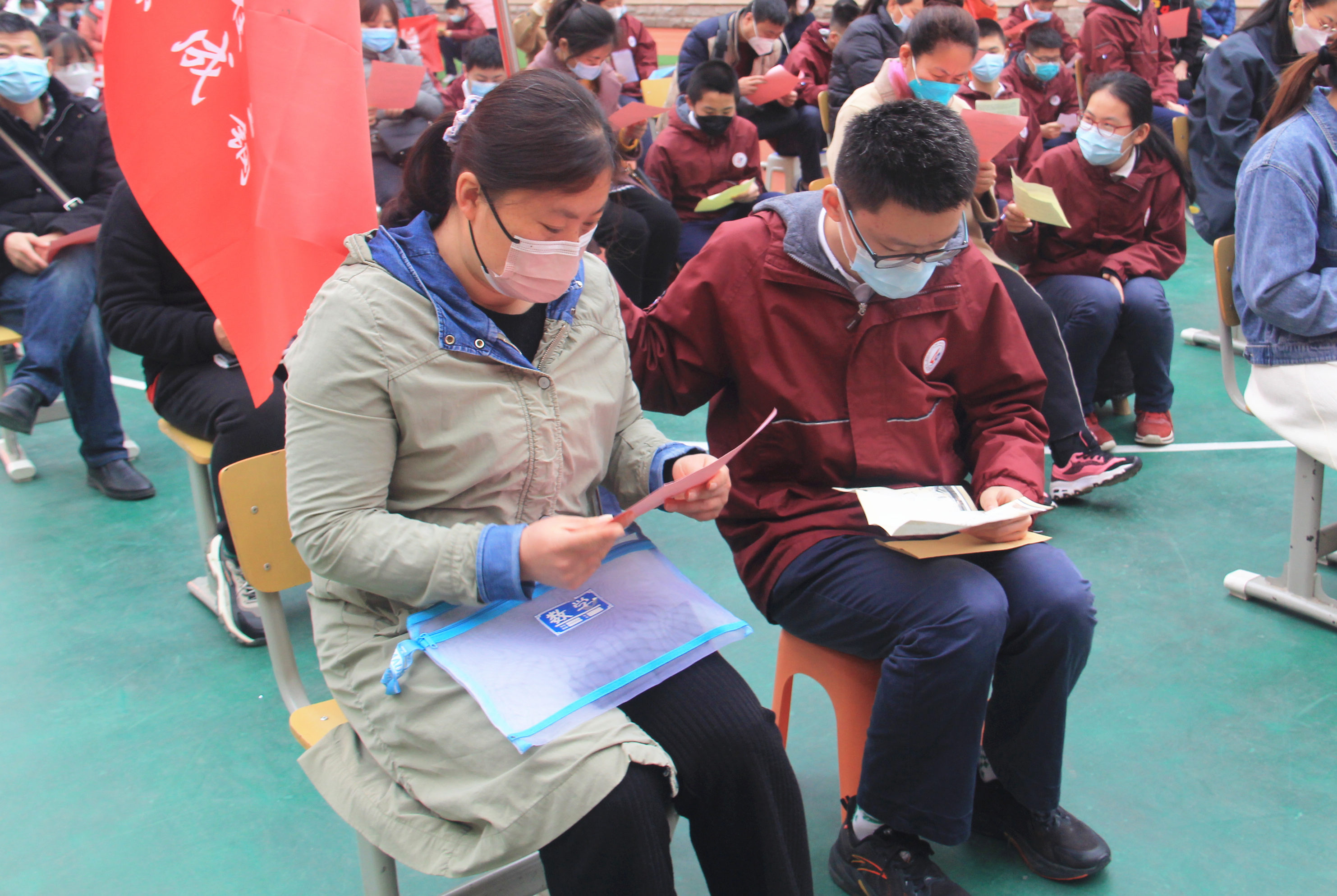 大会由2023届年级长谢楠老师主持,谢楠代表全体九年级老师,对全体家长的到来表示欢迎。全体师生及家长一起观看上一届毕业生通过视频的方式给九年级的学生送来祝福。在亲子互动环节,家长将“中招寄语卡”交给孩子,学生将自己的“中招目标卡”交给家长,拼搏、感动、梦想在亲子之间传递。