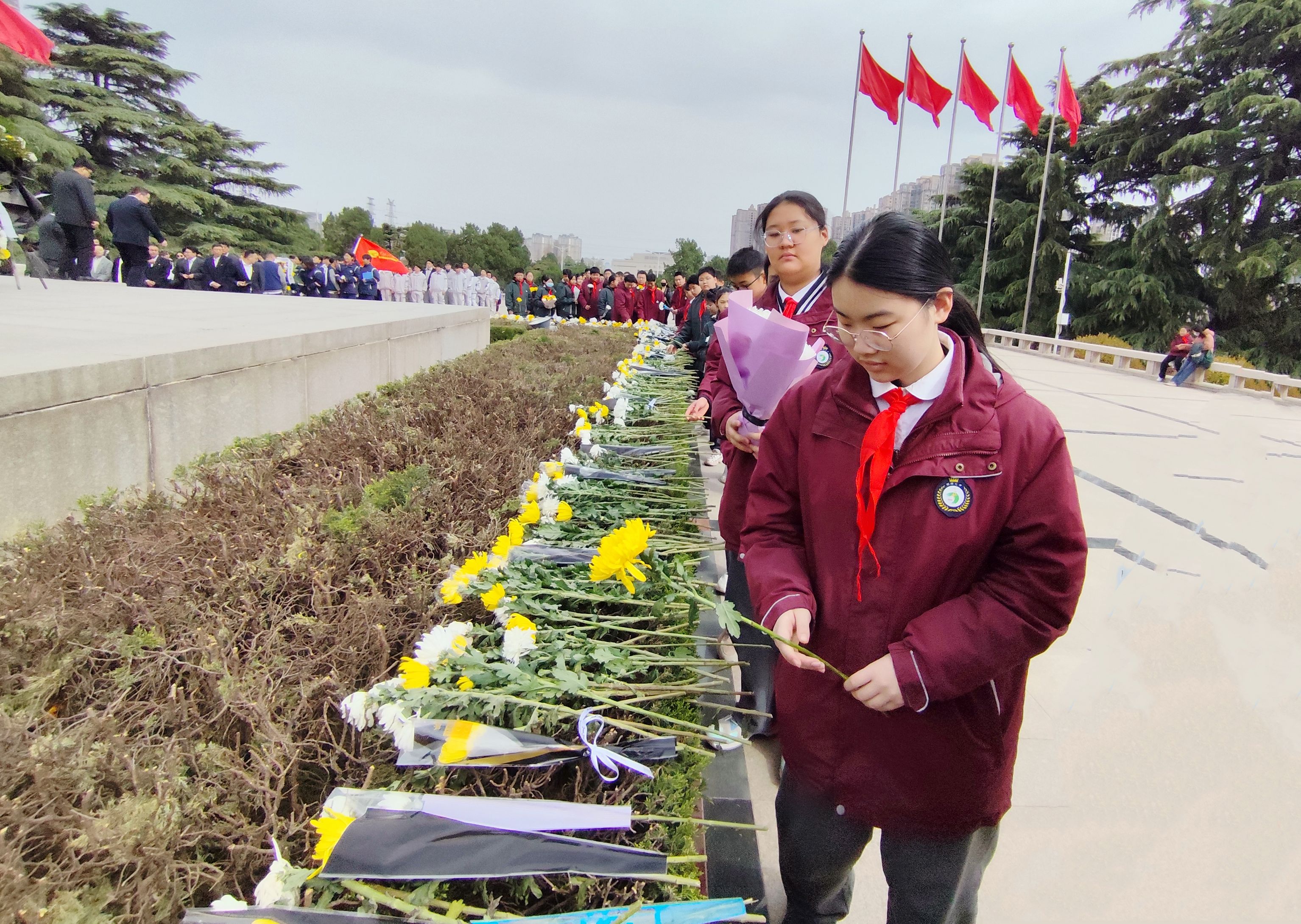 随后,师生们依次缓步绕行,在烈士纪念碑前为先烈们敬献鲜花以表达敬意,寄托哀思。