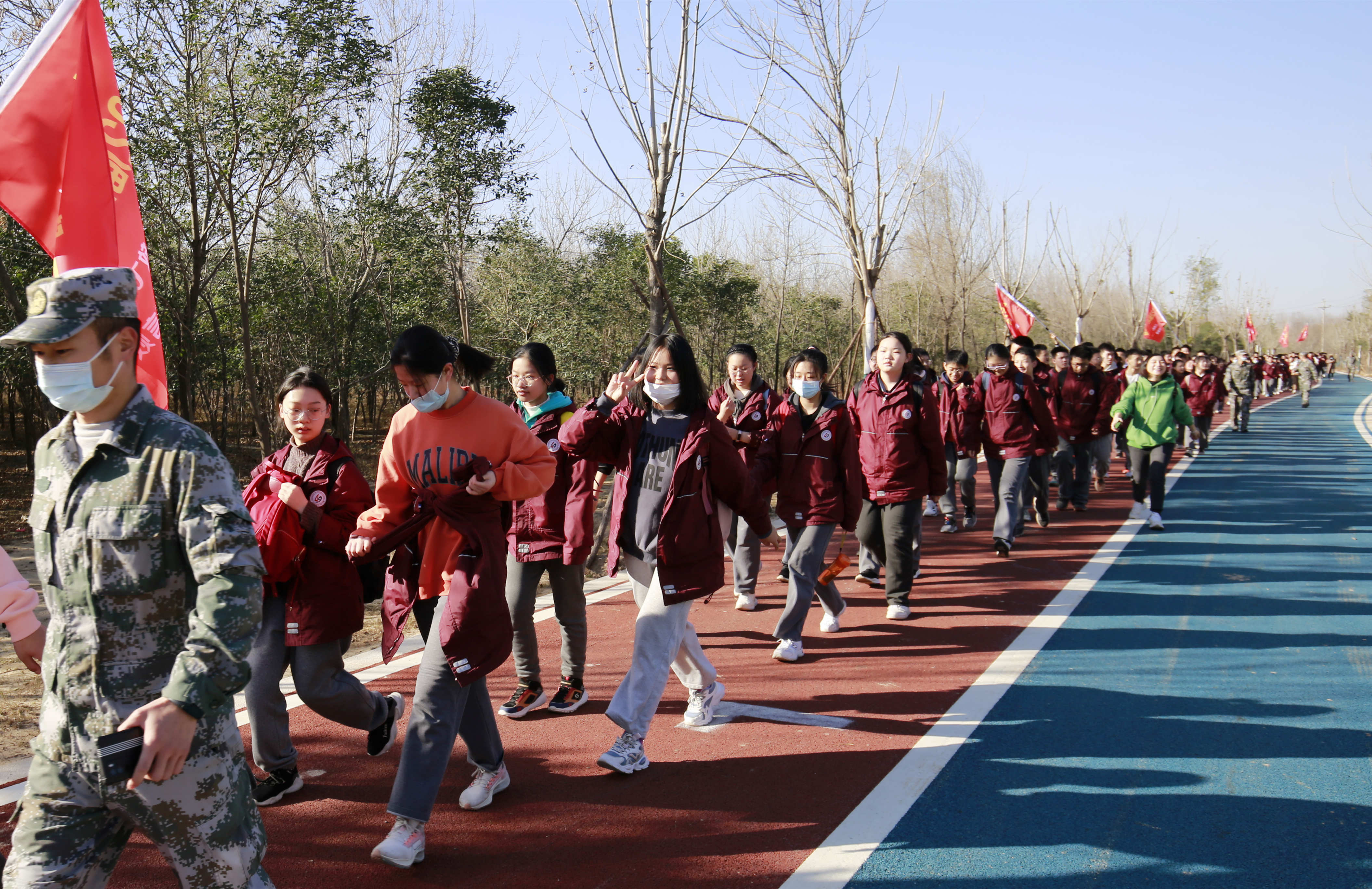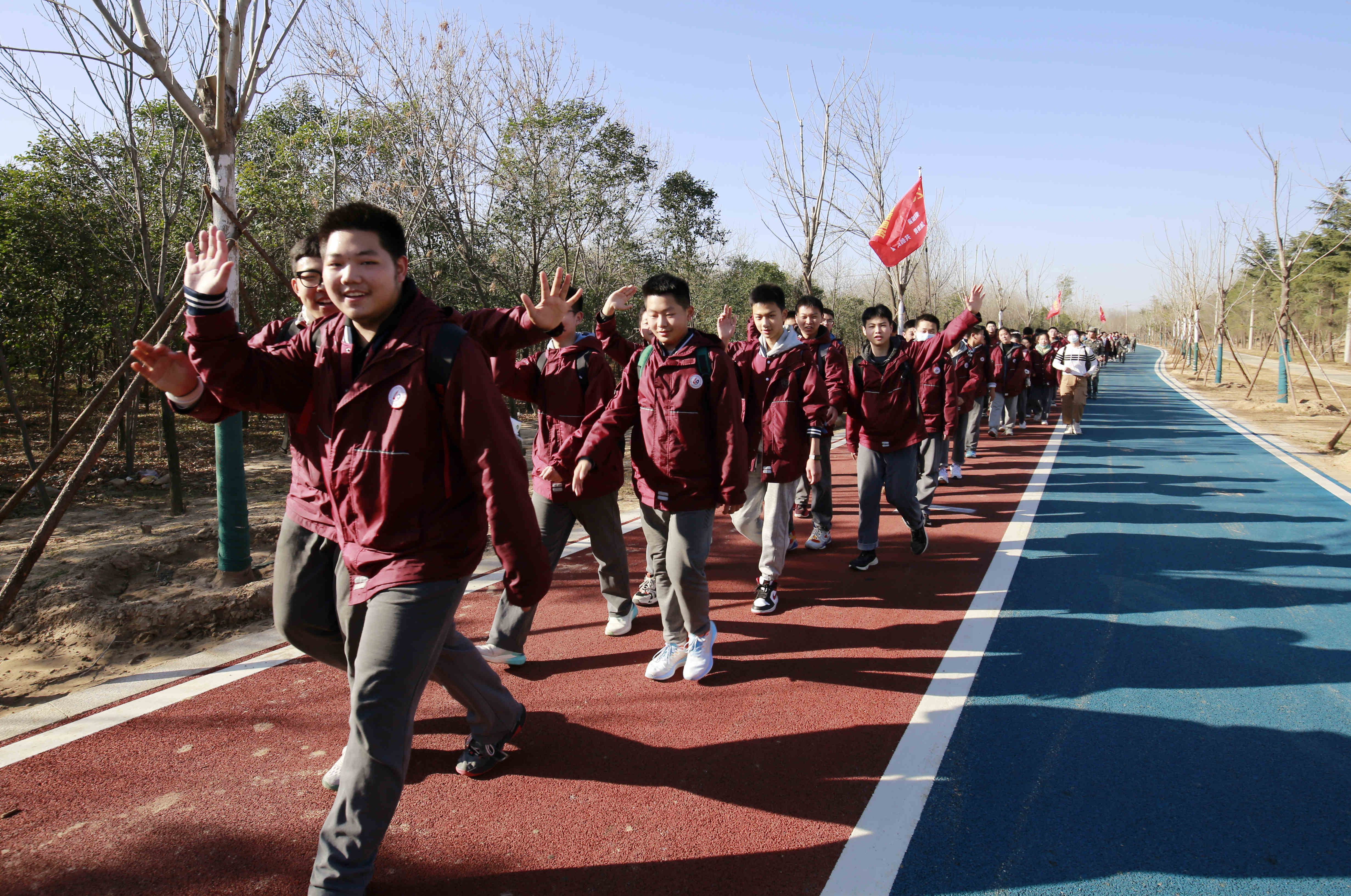 早上7点,九年级师生在校操场举行动员仪式,拓展教官为各班授旗,年级组长彭建杰做动员讲话。为确保交通安全,学生统一乘大巴车抵达出发点,江山路健康步道,在班主任老师和教官的共同组织下,同学们开始徒步拉练。一路上,耀眼的旗帜迎风飞扬;一路上,远足的队伍欢快高歌;一路上,师生的步伐从未停歇。虽然衣襟湿透,甚至脚掌起泡,但一张张青春的脸庞,一个个灿烂的笑容,不言畏惧,不言放弃。