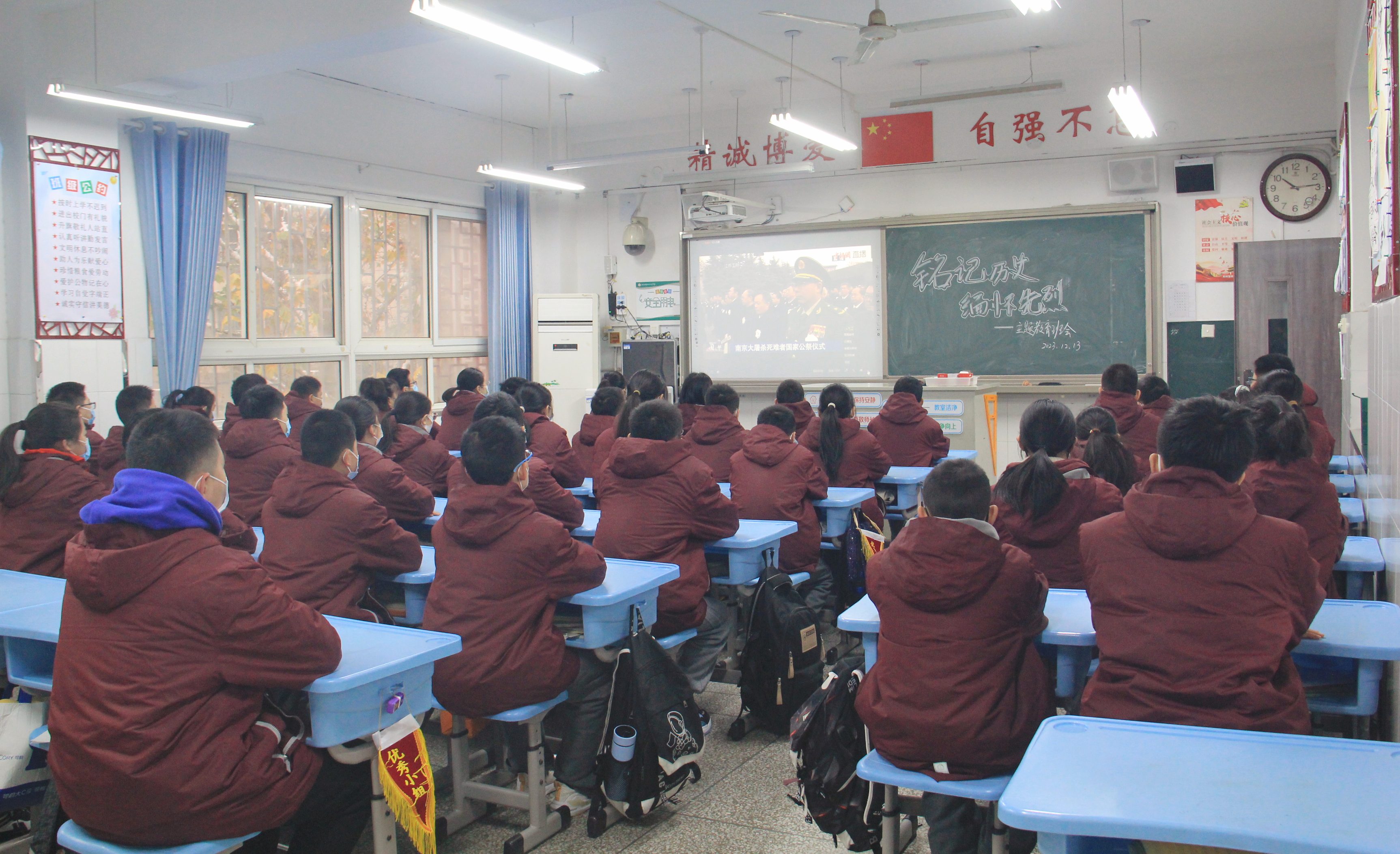 各班班主任带领学生一起观看了与南京大屠杀相关的影视,学生们了解了“南京大屠杀”这一段悲痛的历史,对国家公祭日有了更深层次的理解。观影结束后,同学们共同为遇难同胞默哀,深切悼念在南京大屠杀和日本侵华战争中遇难的同胞们。最后,老师为学生们讲述了烈士纪念日以及国家公祭日设立的意义,同学们对国家公祭日有了更深入的了解,更加深刻地牢记了中华民族那段屈辱与抗争的历史,也更懂得了当今和平生活的来之不易。学生们纷纷表示,一定要努力学习,奋发图强,勿忘国耻,振兴中华。